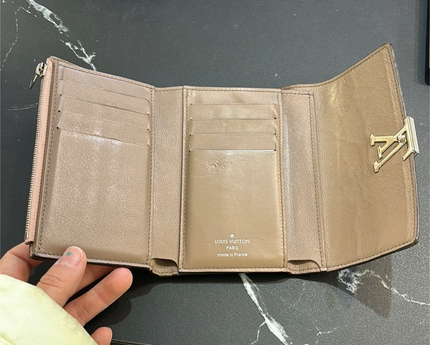 Authentic Louis Vuitton Capucines wallet. Pink leather. Multiple card slots and compartments. Zip closure. Made in France. Pre-owned.