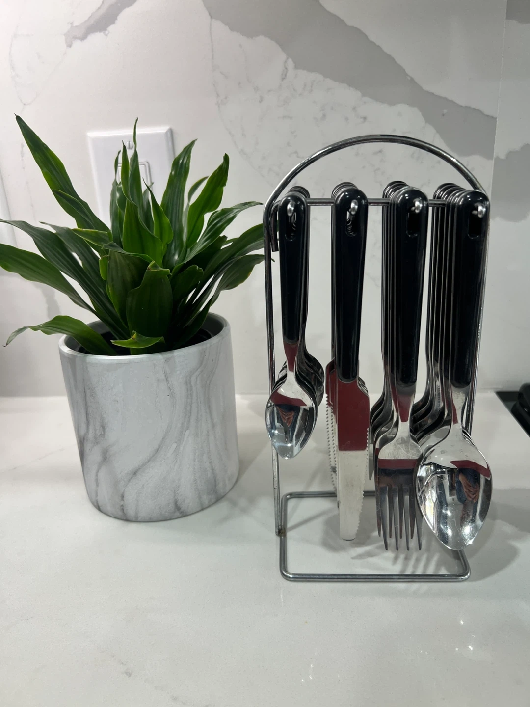 Selling a cutlery set with a stand. It includes forks, spoons, and knives, all neatly organized in a silver-tone stand. Great for keeping your kitchen organized and your utensils easily accessible