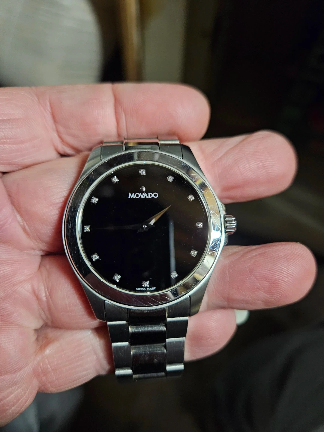Selling a Movado watch with a sleek black dial. It has a stainless steel band and a classic design. The watch is in good condition and ready for a new owner!