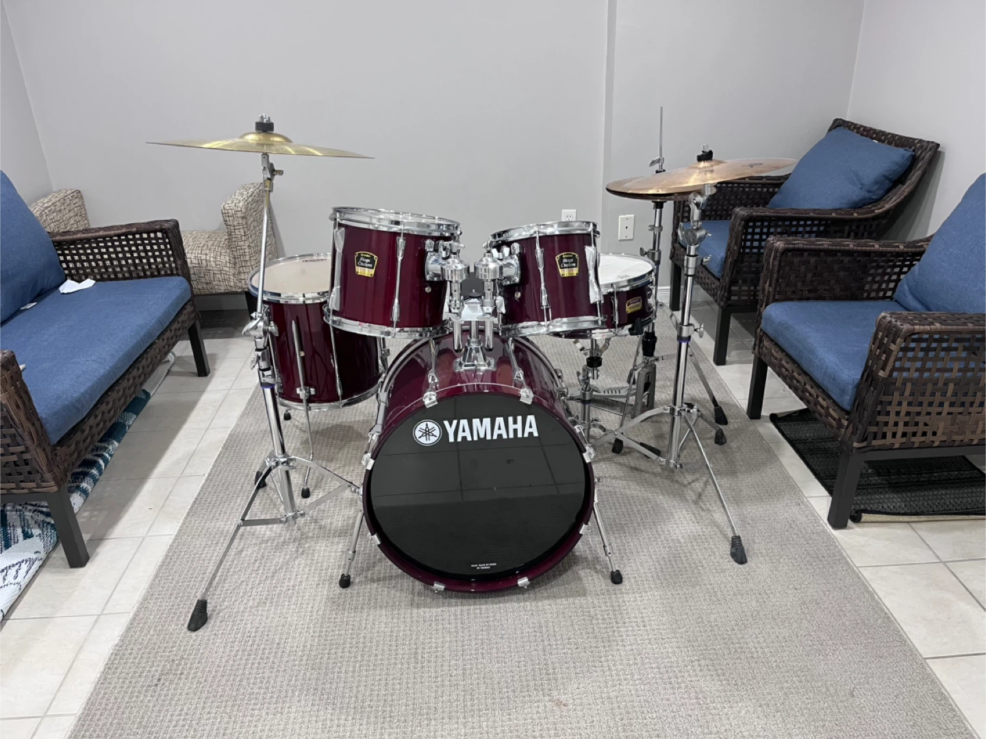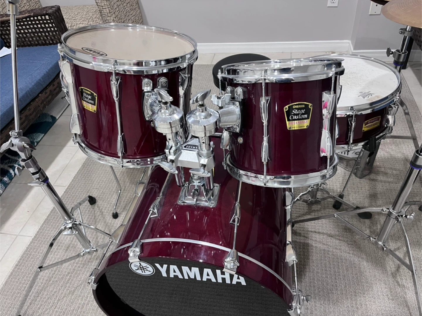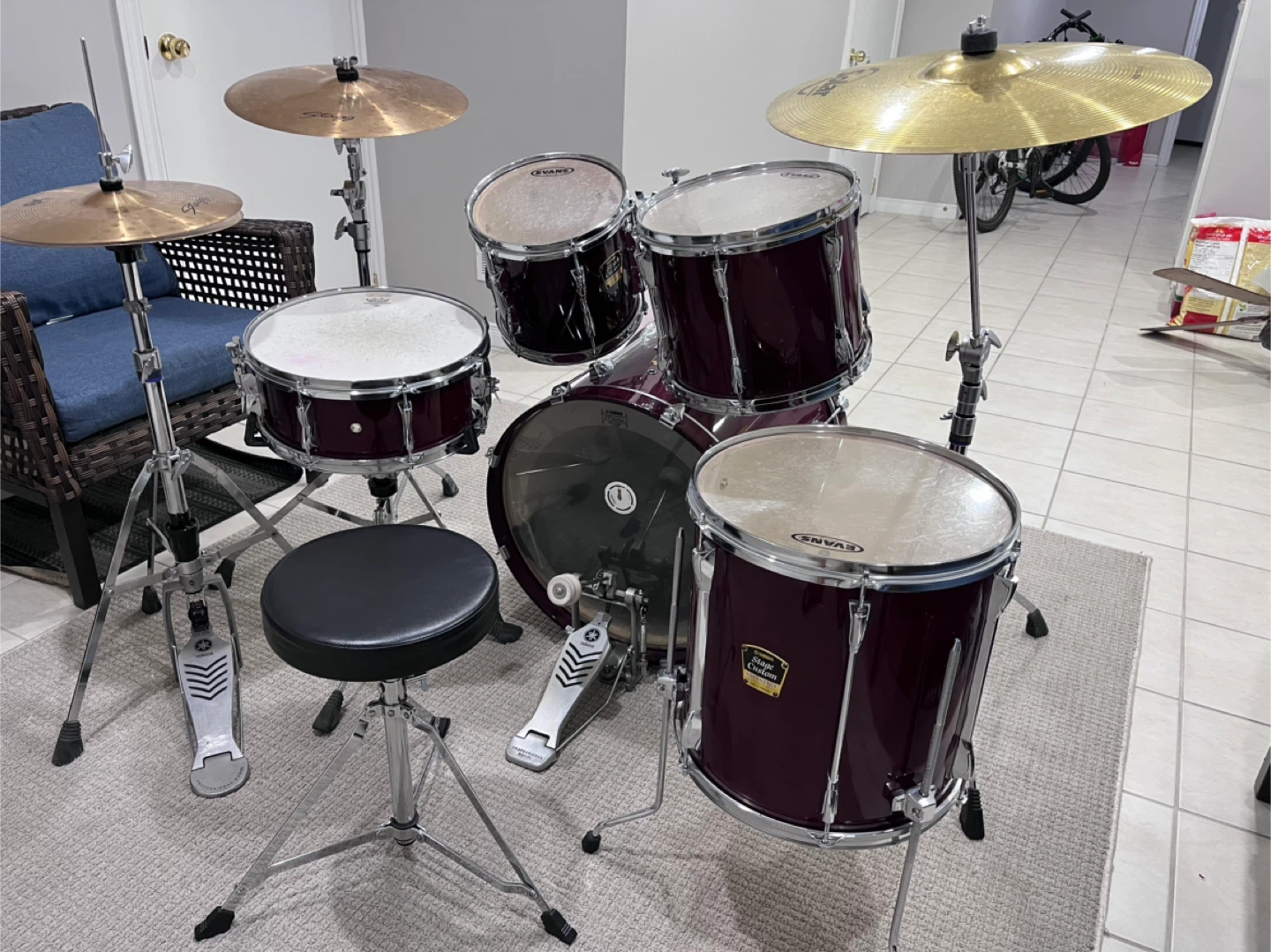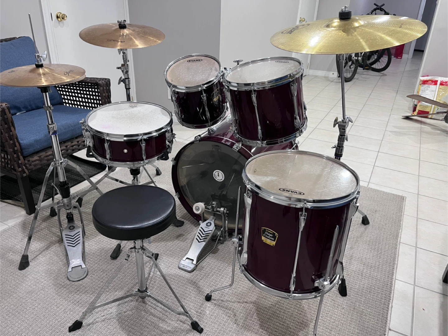 Selling a Yamaha Stage Custom Advantage drum set! It's in good condition and ready for a new musician to enjoy. This set includes drums, cymbals, stands, and a stool. Perfect for someone looking to get started or upgrade their current kit
