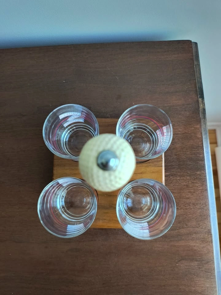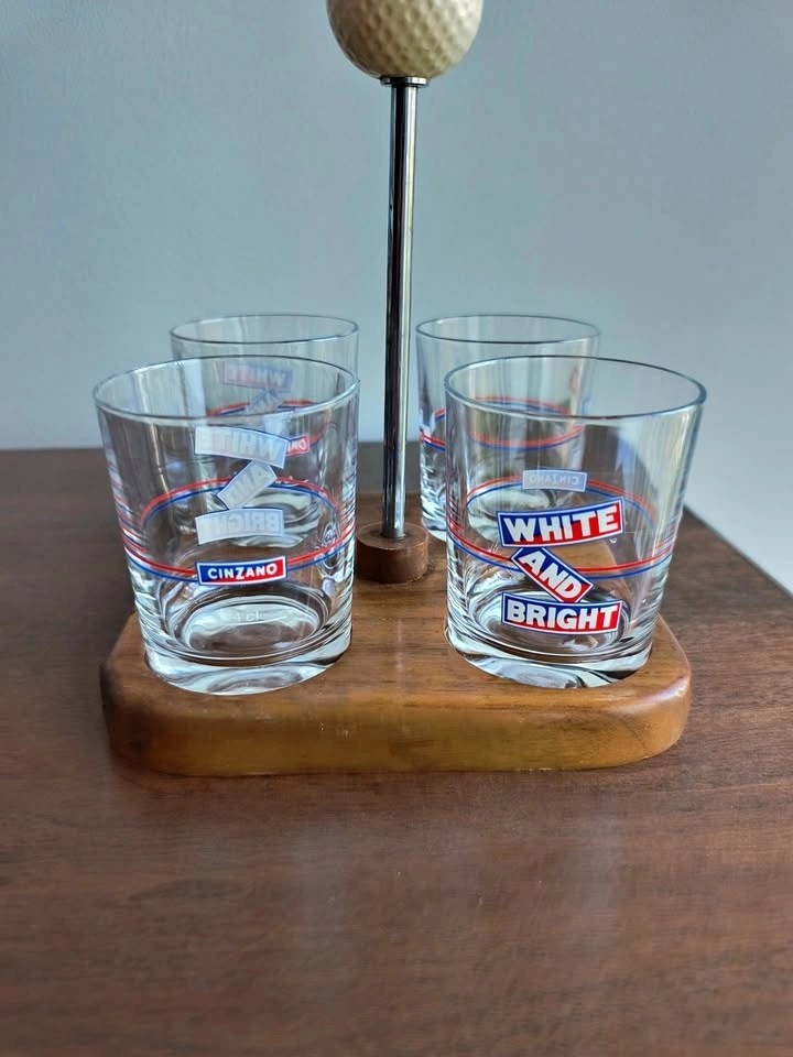 Serve your drinks with vintage flair using this eye-catching set of 1960s Cinzano promotional glasses, featuring the bold “White and Bright” slogan. This set of four 4cl glasses comes in a charming wooden caddy with a golf ball-themed handle, making it the perfect statement piece for your bar cart, man cave, or vintage glassware collection.