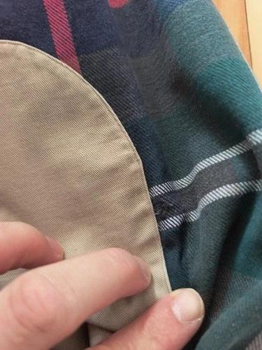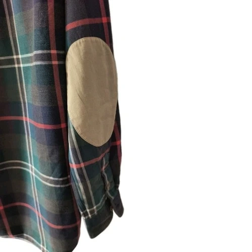 Vintage pre-owned condition with minor authentic signs of wear. Note: There is a small hole/fray located near the right elbow patch (see close-up photo). This adds to the rugged, broken-in workwear aesthetic. Price reflects this imperfection.