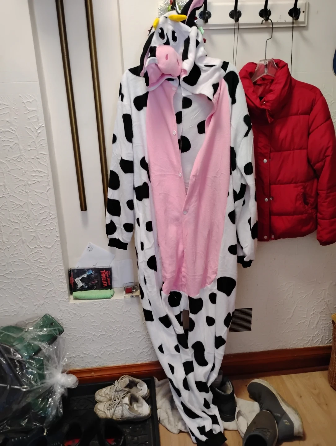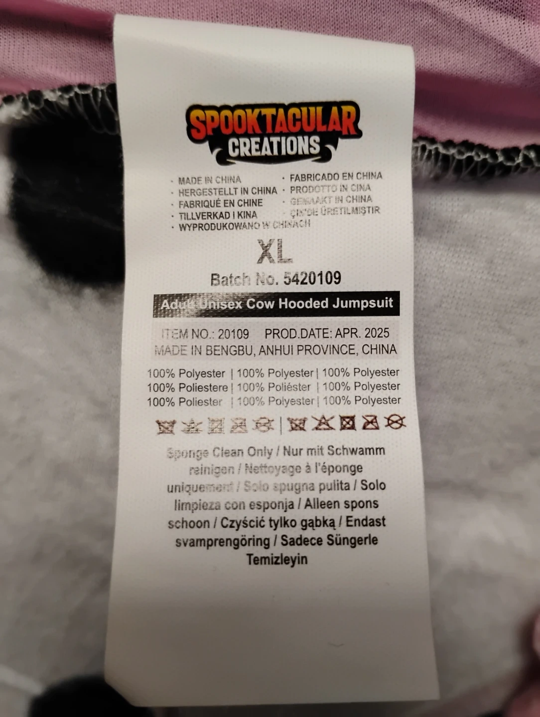 Snuggle up in this super cute Spooktacular Creations adult unisex cow hooded jumpsuit! It's an XL and made of 100% polyester. The production date is April 2025.