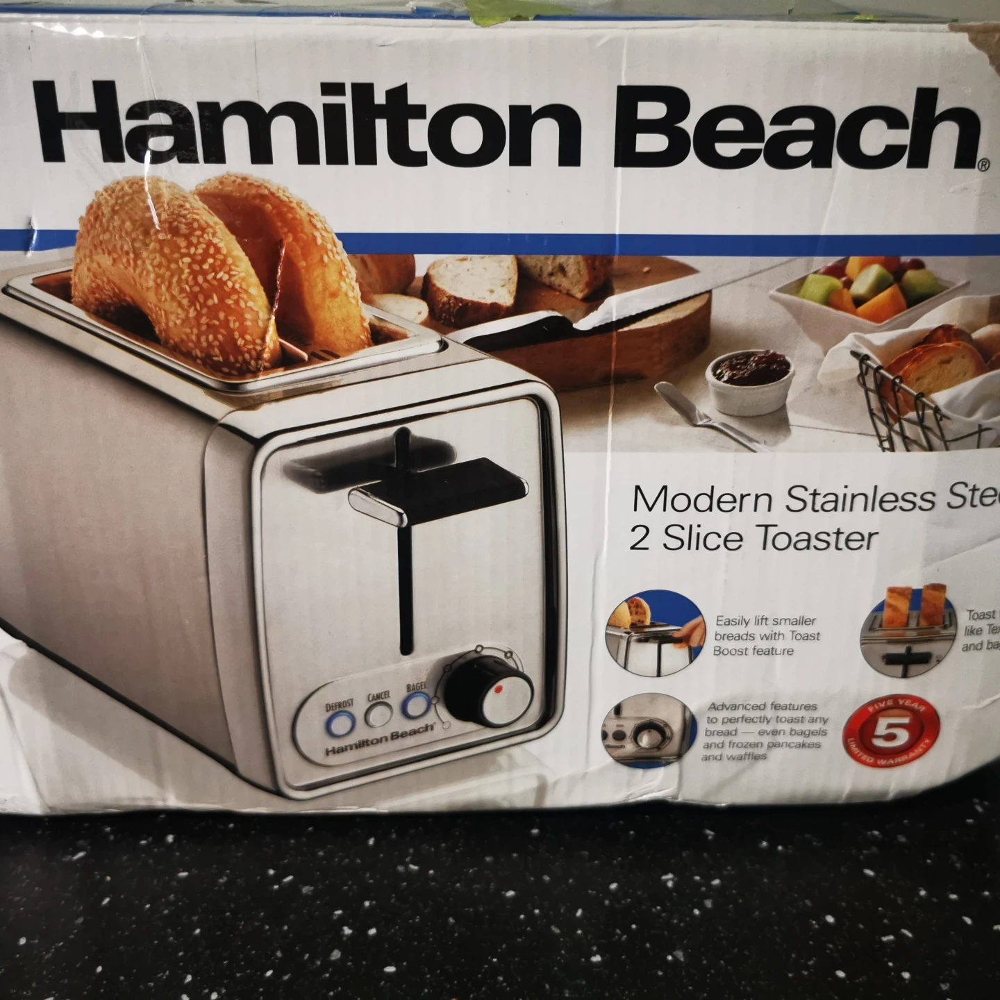 Selling a Hamilton Beach 2-Slice Toaster! It's a modern stainless steel toaster that easily lifts smaller breads with its Toast Boost feature. It also has advanced features to perfectly toast any bread, even bagels and waffles. It has a 5 year warranty!