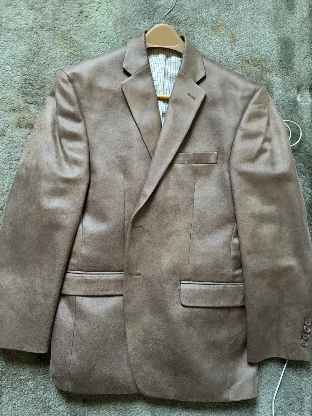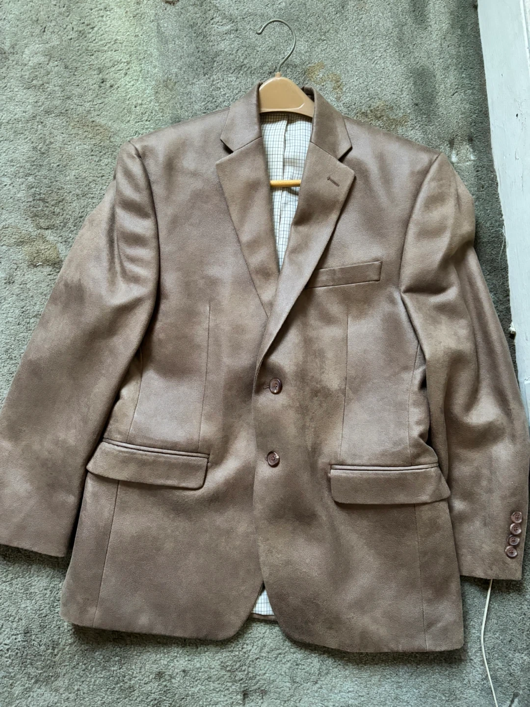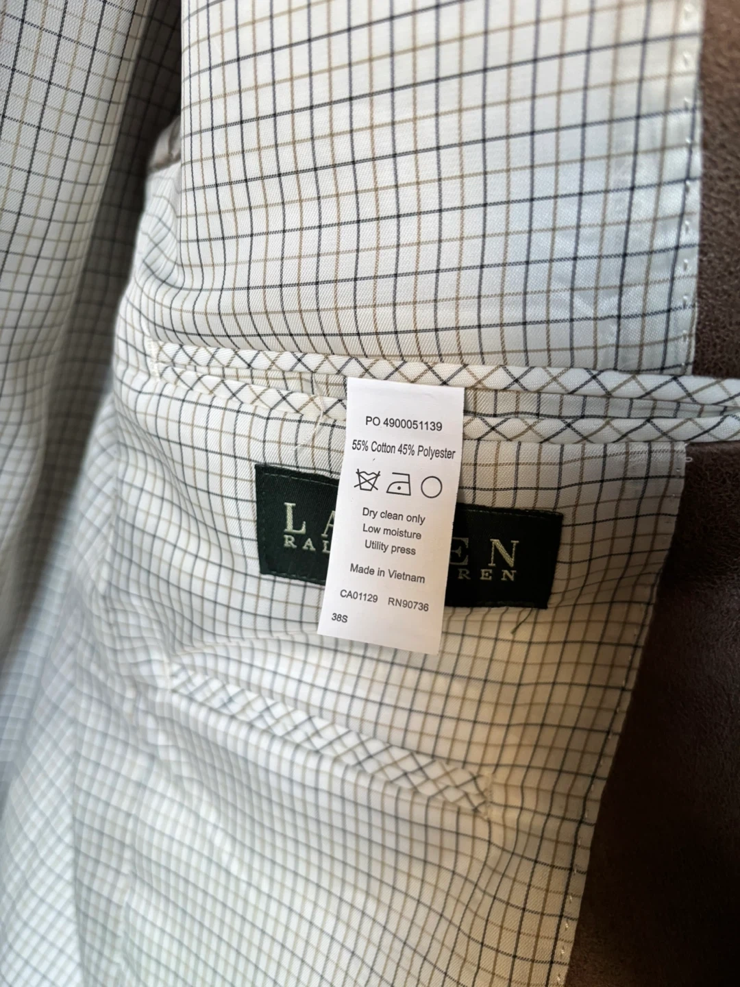 Selling a Lauren Ralph Lauren blazer in a nice brown color! The size is 38S. The outer material has a suede-like texture. The inner lining is 55% cotton and 45% polyester. It's in great condition and ready for a new owner