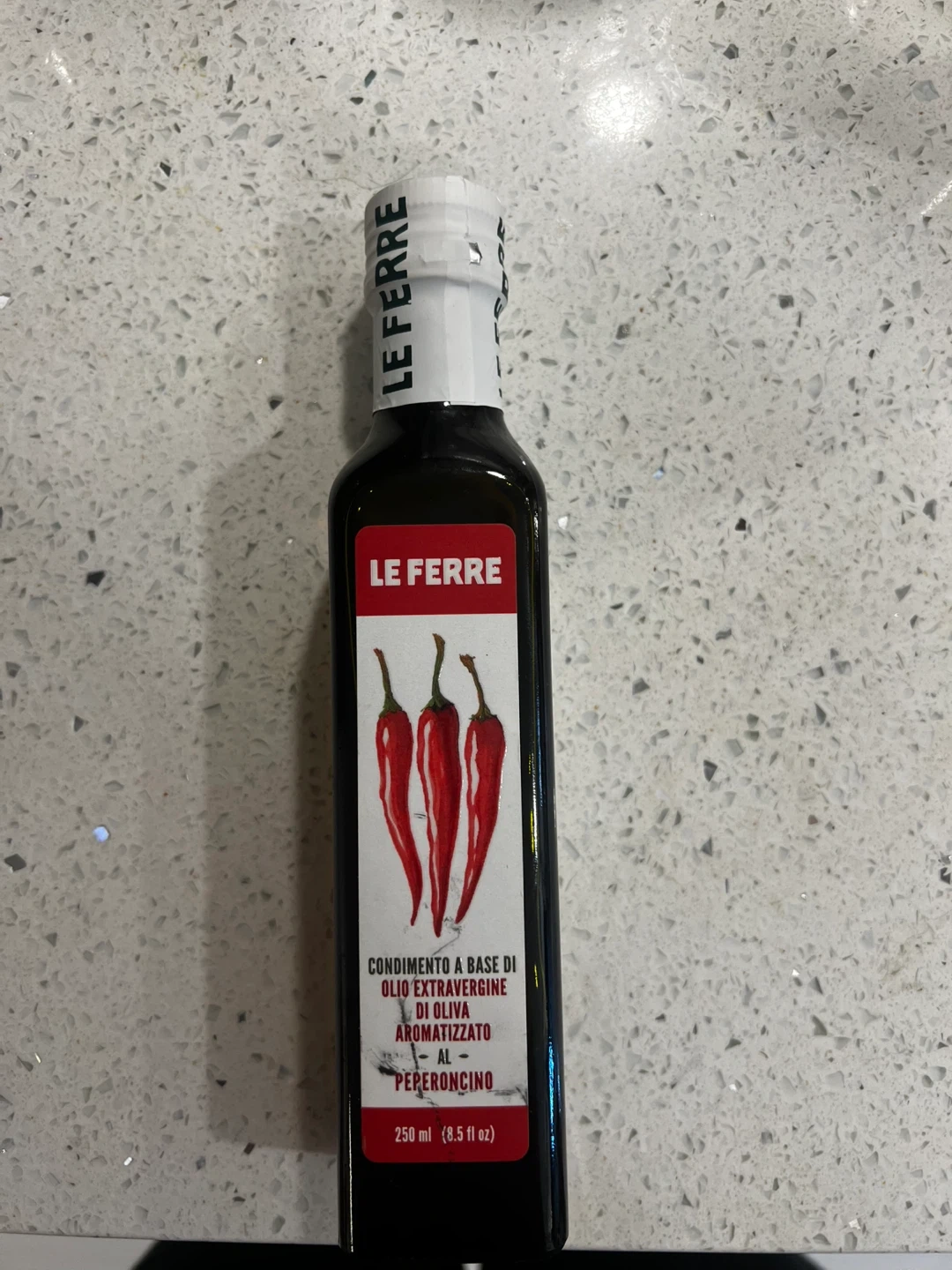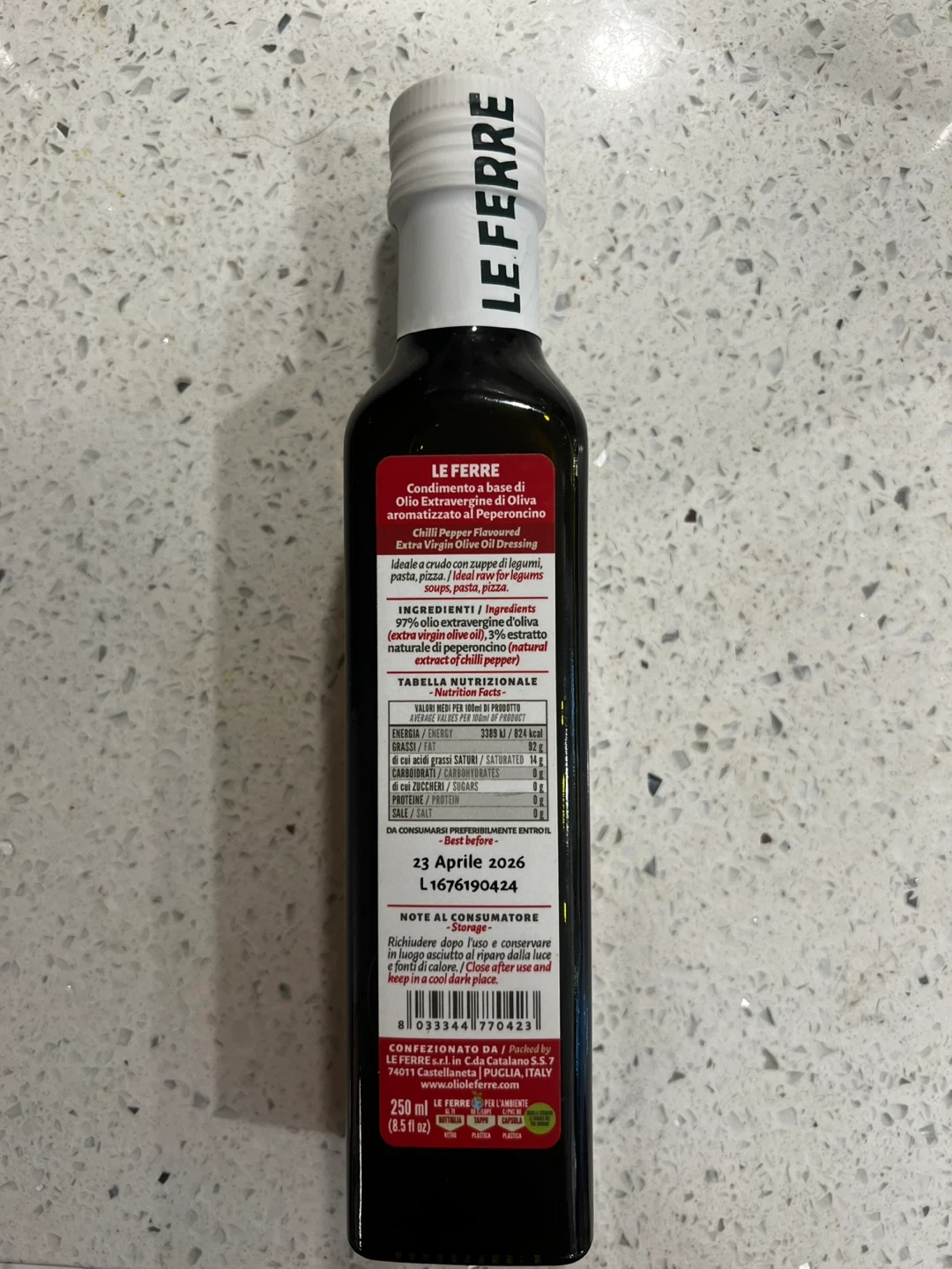 This is a bottle of Le Ferre Condimento a base di olio extravergine di oliva aromatizzato al peperoncino, or chilli pepper extra virgin olive oil dressing. It's ideal for using raw on soups, vegetables, pasta or pizza. The bottle contains 250 ml (8.5 fl oz). The expiration date is April 23, 2026