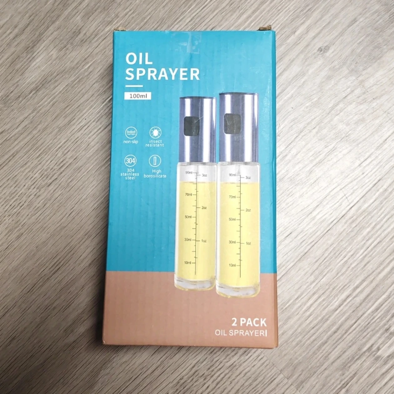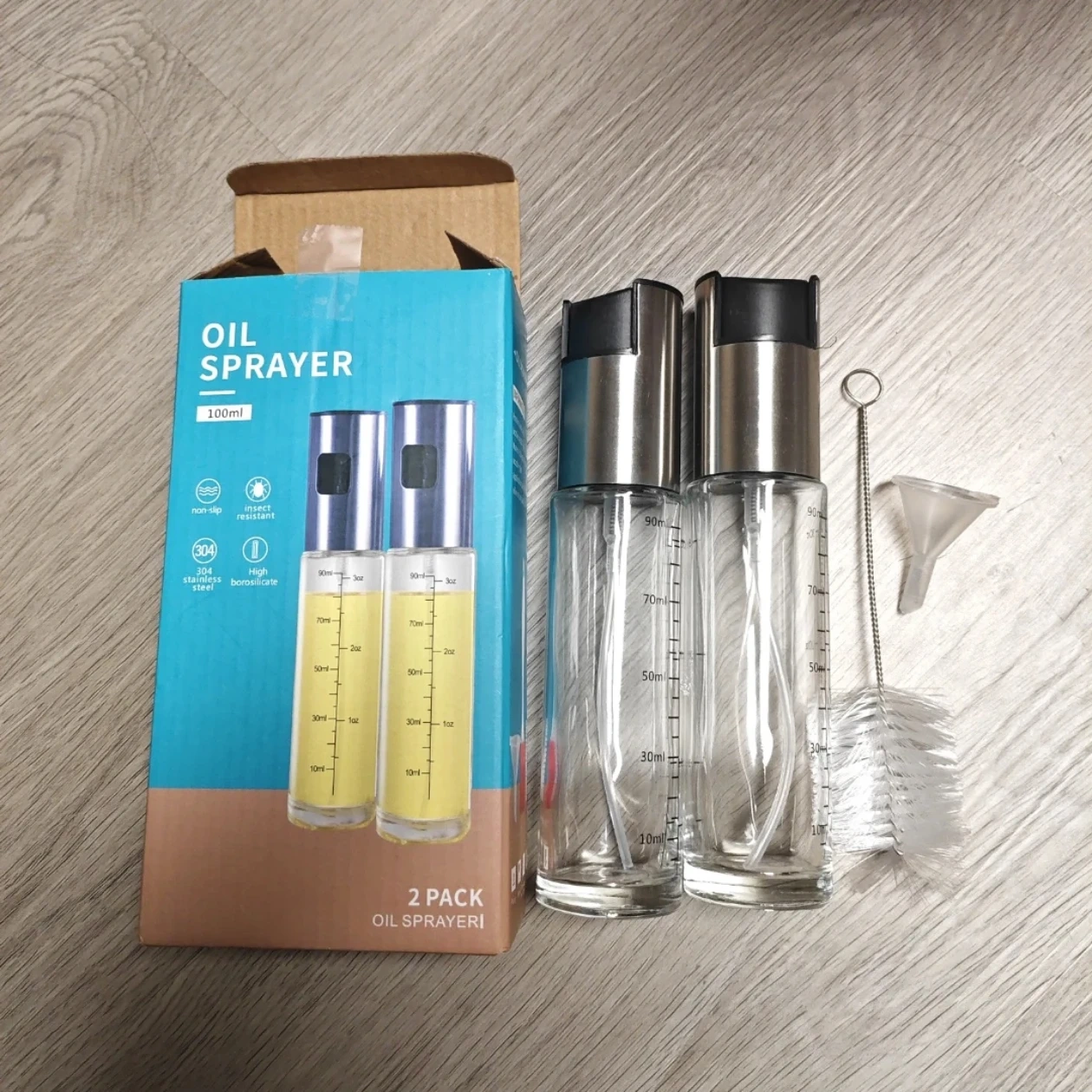 Selling a two-pack of oil sprayers! Each sprayer has a 100ml capacity. The box includes a cleaning brush and a small funnel for easy filling. They're made with 304 stainless steel and high borosilicate glass. The sprayers are also non-slip and insect resistant. Great for cooking!