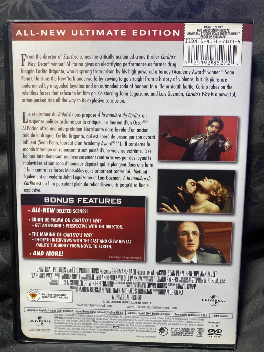 Selling Carlito's Way: All-New Ultimate Edition DVD starring Al Pacino and Sean Penn. A Brian De Palma film. Includes all-new deleted scenes and an insider's perspective with the director, plus in-depth interviews with the cast and crew. Enjoy this action-packed crime thriller!