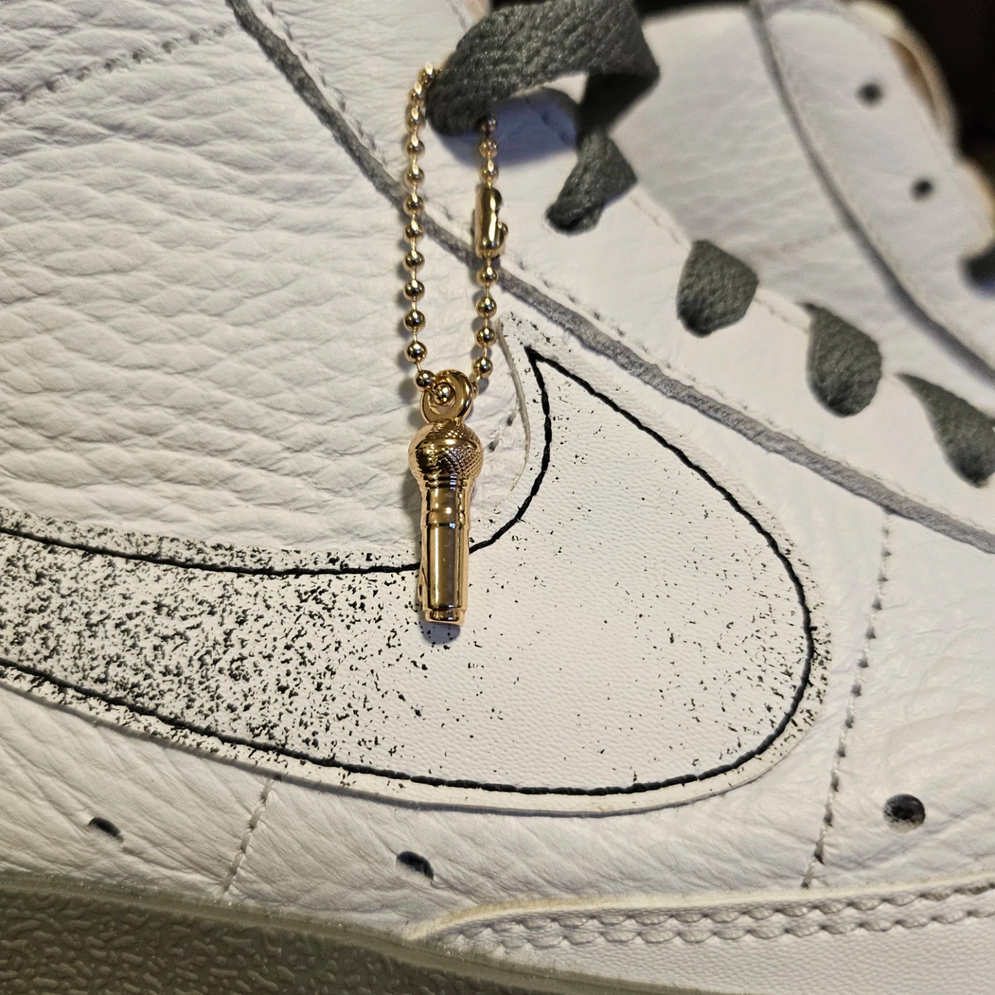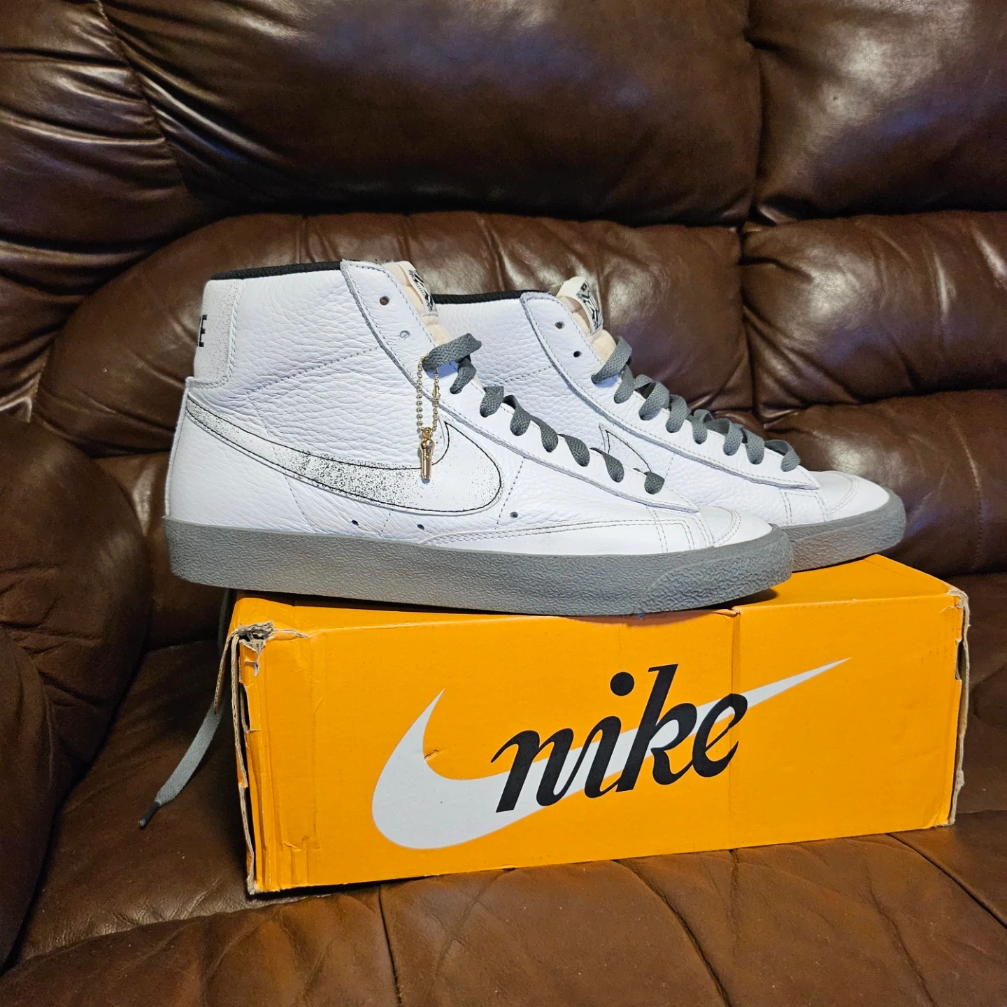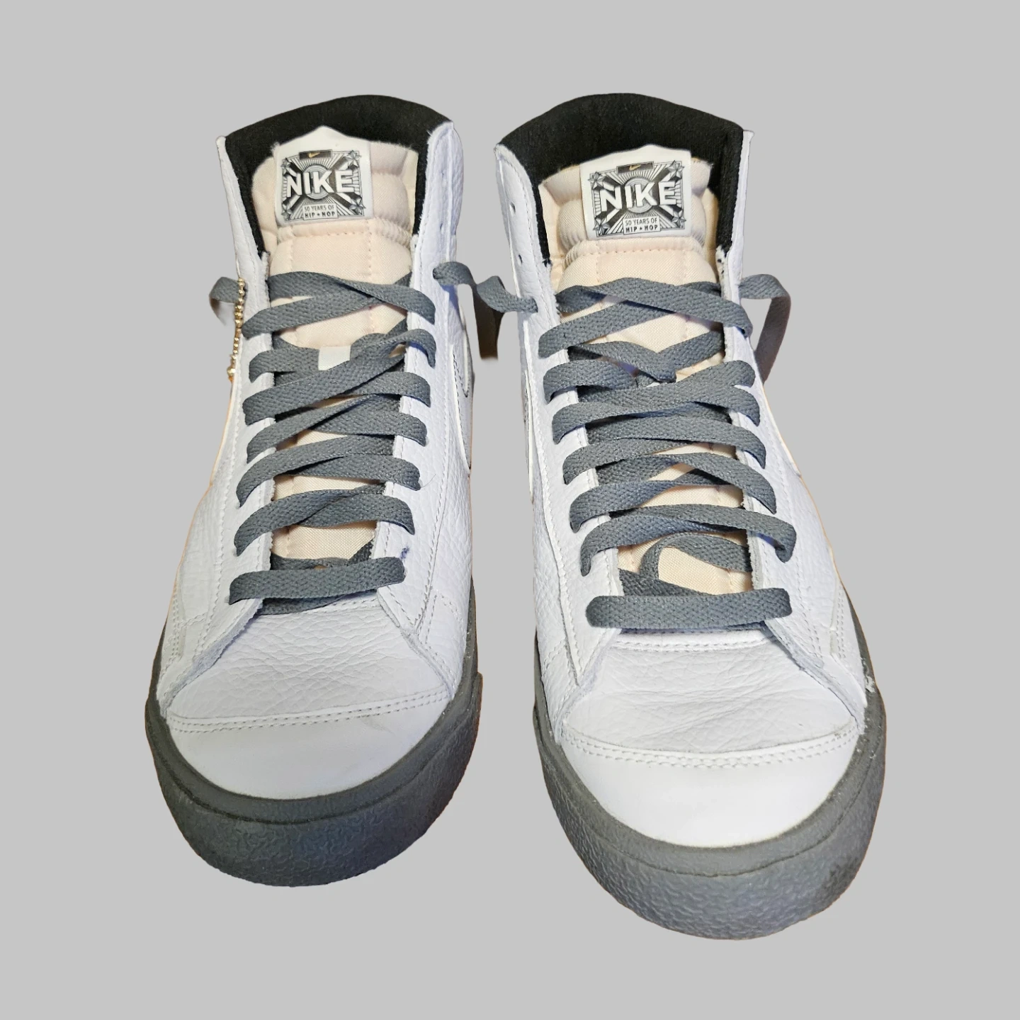 Selling a pair of new Nike Blazer Mid '77 Premium sneakers in white. Celebrating "50 Years of Hip-Hop" sneaker in white tumbled leather with smoke grey accents. Come with a golden microphone charm.