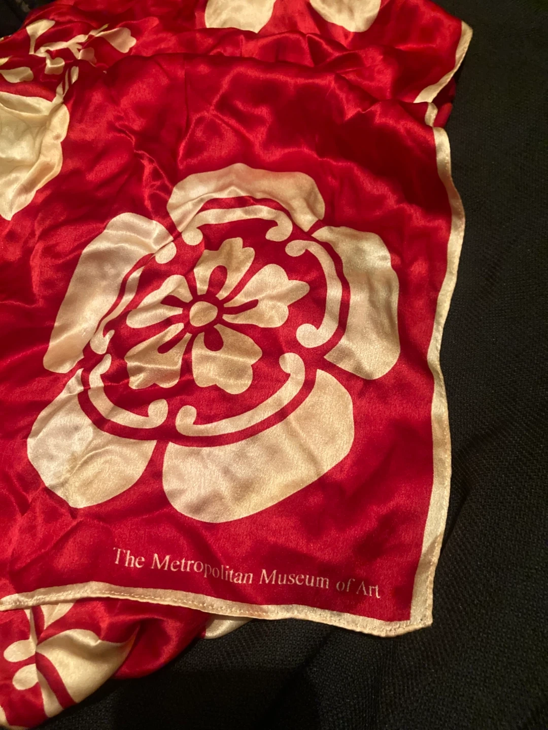 Beautiful silk scarf from The Metropolitan Museum of Art. The scarf features a red background with a floral pattern in an off-white color. Perfect for adding a touch of elegance to any outfit
