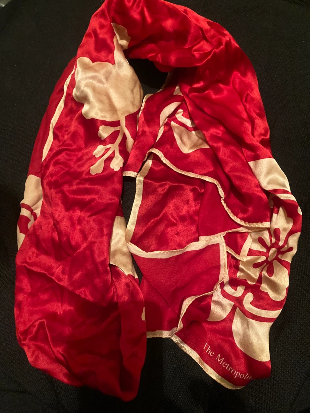 Beautiful silk scarf from The Metropolitan Museum of Art. The scarf features a red background with a floral pattern in an off-white color. Perfect for adding a touch of elegance to any outfit