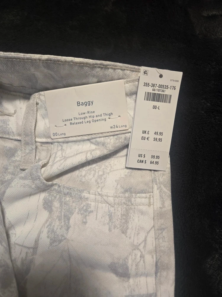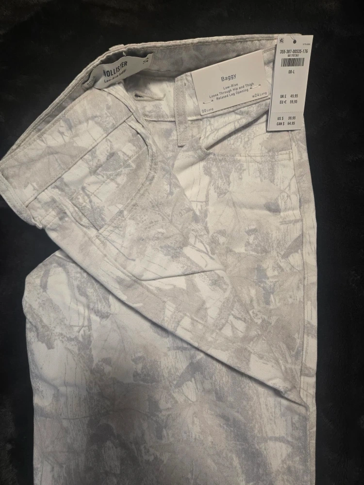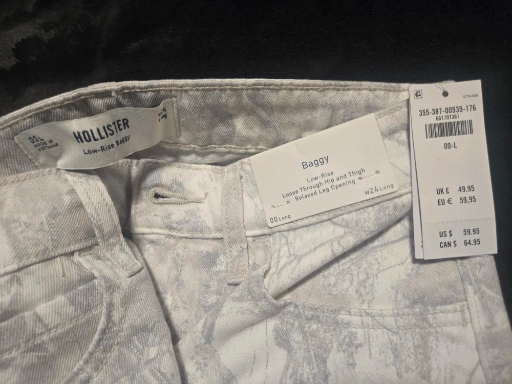 These are brand new Hollister low-rise baggy jeans! They are a size 24 waist and feature a loose fit through the hip and thigh with a relaxed leg opening. The jeans have a unique pattern and the tag shows they originally retailed for $64.95 CAD