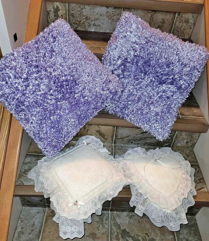 The light purple soft fuzzy pillows are 17” square. They are soft and cushy.
