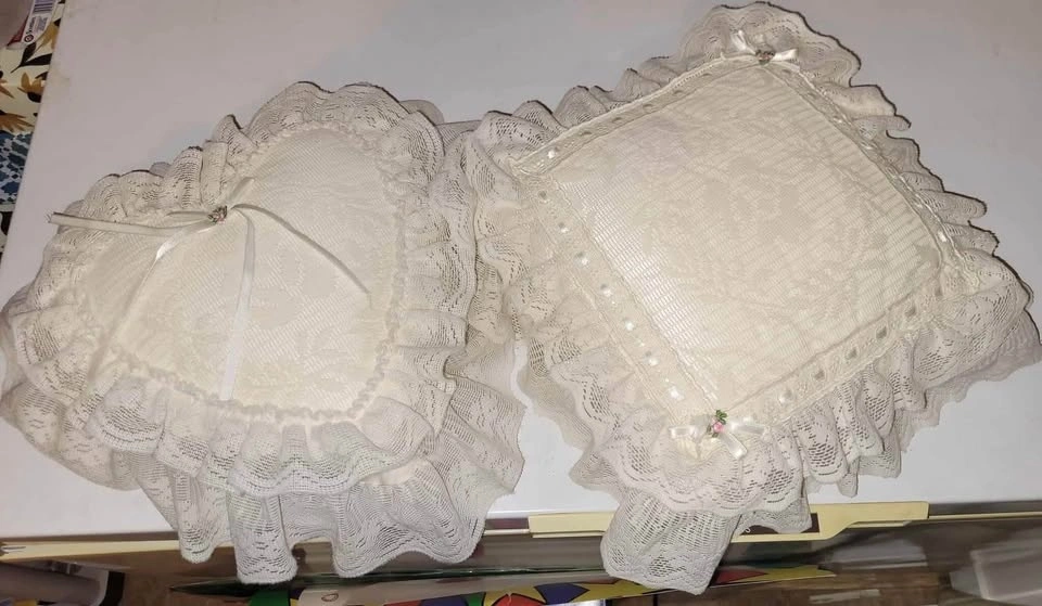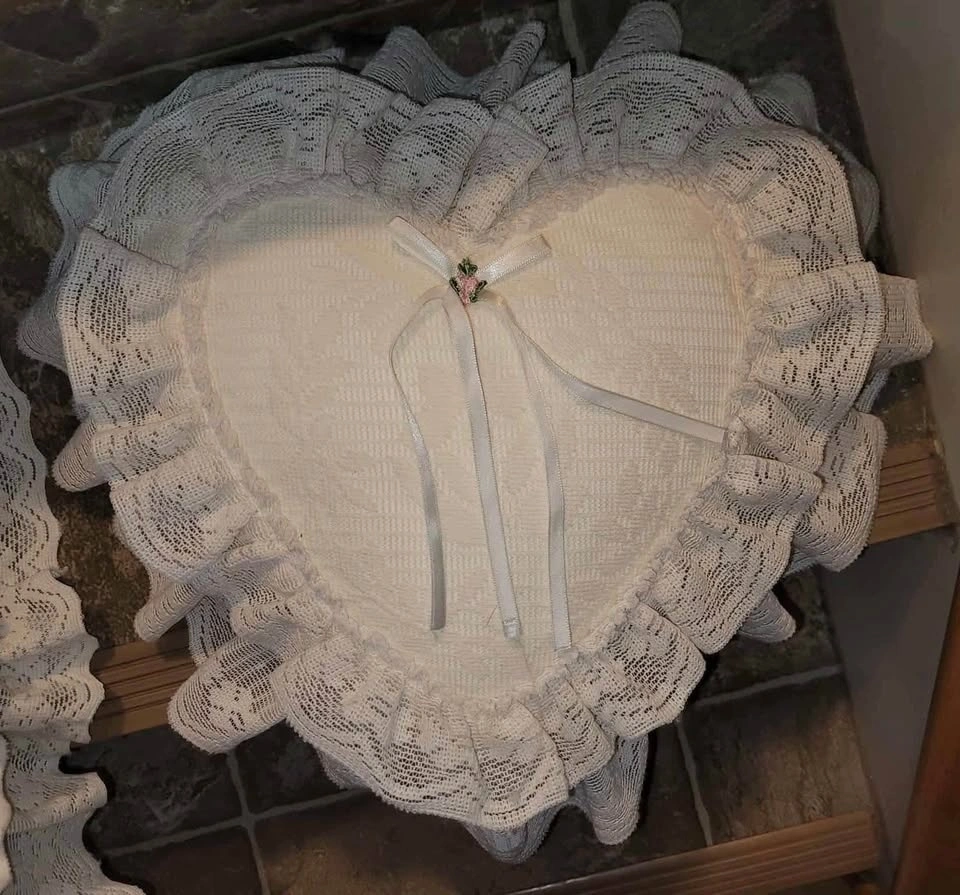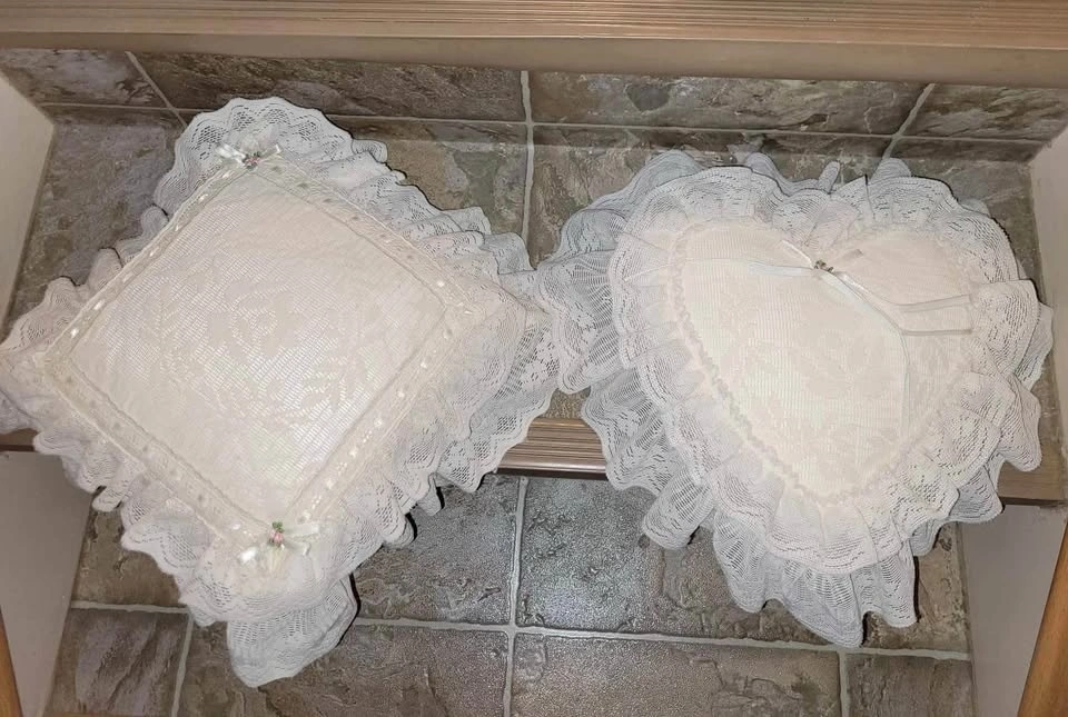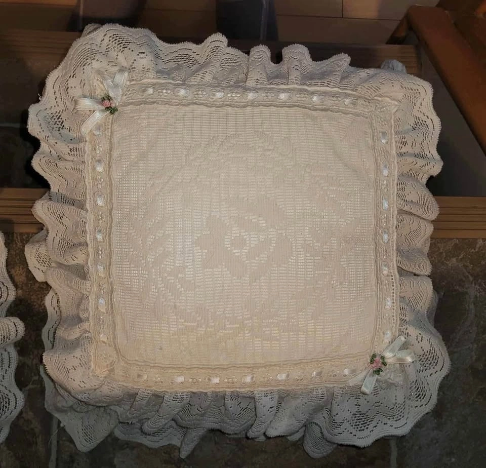 The vintage pillows are Ivory in color and measure 17” across to the lace edges. Beautiful and elegant!