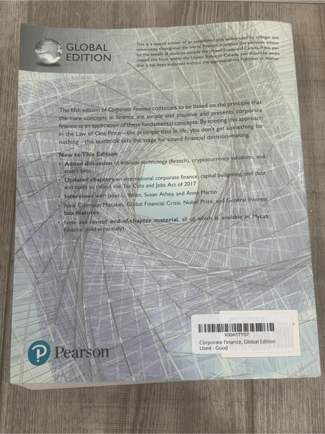 Selling Corporate Finance, Global Edition (5th Edition) by Jonathan Berk & Peter DeMarzo (ISBN‑10: 1‑292‑30415‑4, ISBN‑13: 978‑1292‑30415‑1).