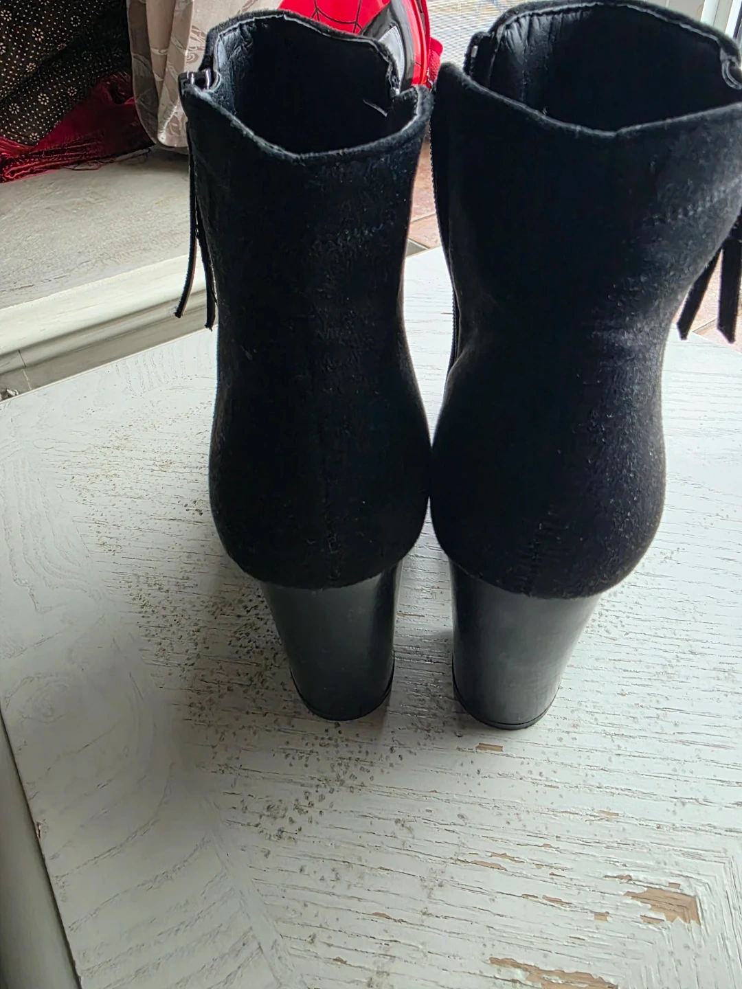 Selling a pair of black ankle boots. They are made of a soft suede material and have a side zipper detail. They are in good condition and would be a stylish addition to your wardrobe! Only worn two times.