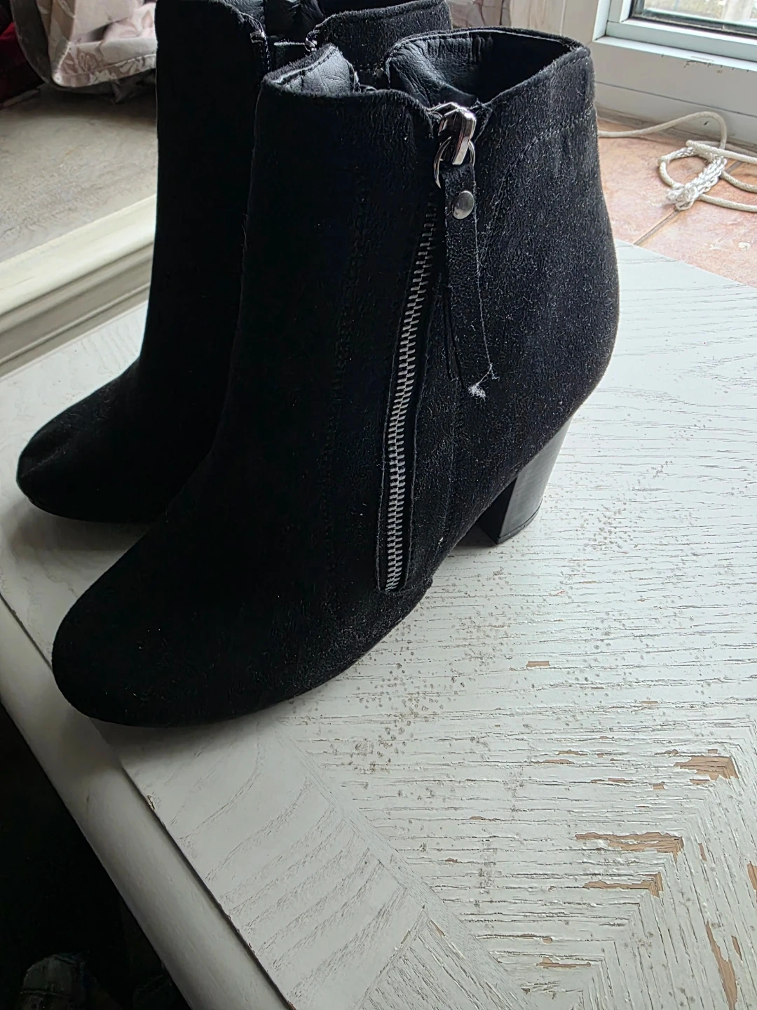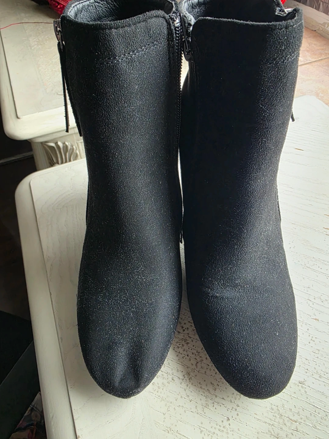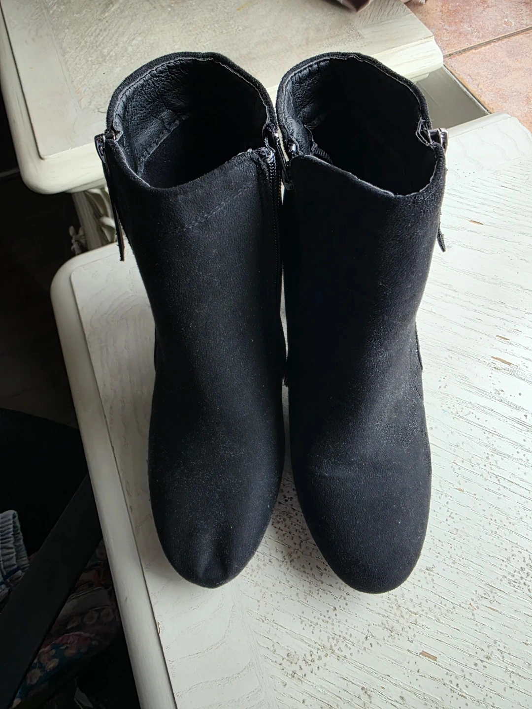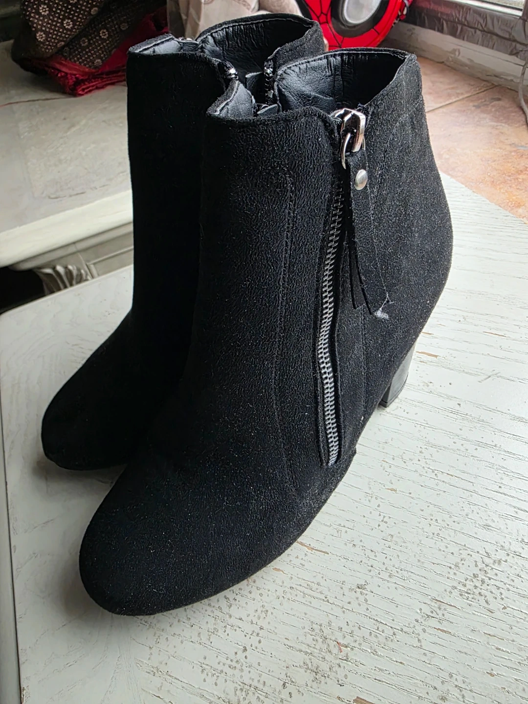 Selling a pair of black ankle boots. They are made of a soft suede material and have a side zipper detail. They are in good condition and would be a stylish addition to your wardrobe! Only worn two times.