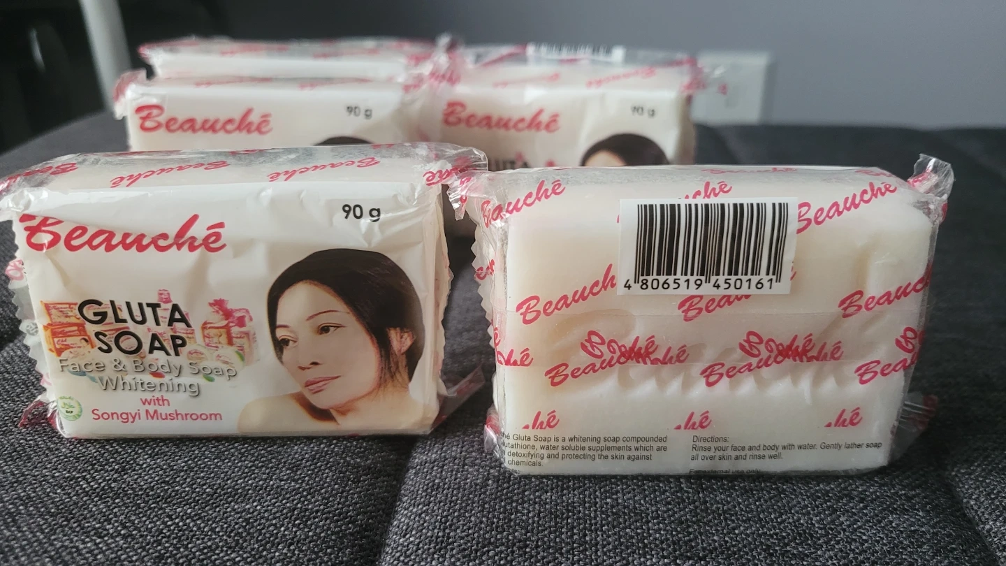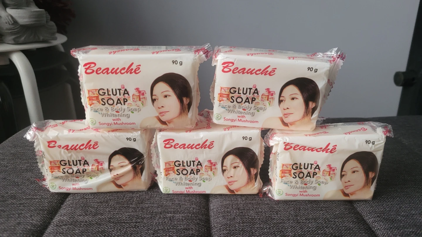 Beauche Gluta Soap. It's a face and body soap that helps with whitening, and it contains Songyi Mushroom. Each bar is 90g.