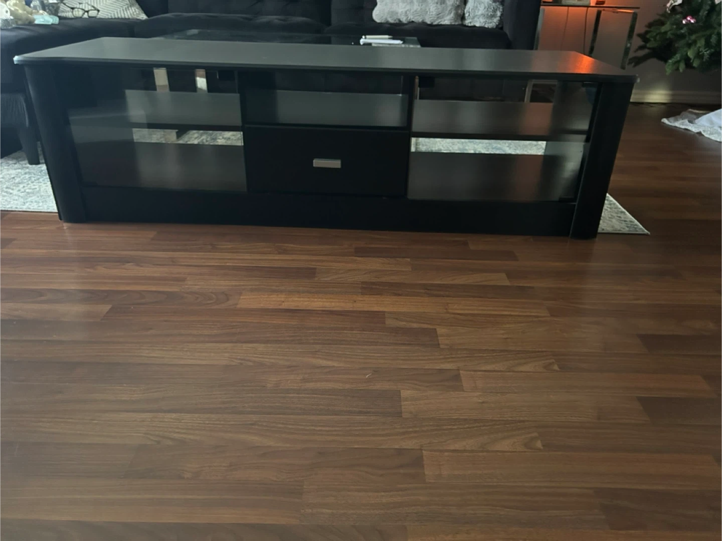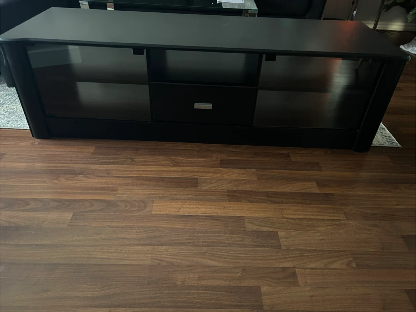 Selling a black TV stand in good condition. It features open shelving and a drawer for storage. Perfect for organizing your entertainment area!