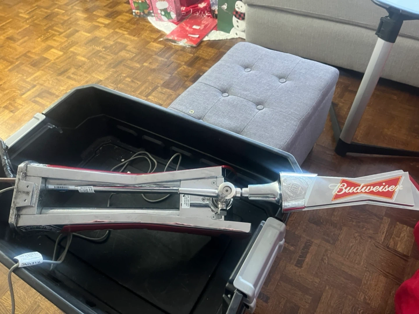 This is a Budweiser Signature Draught beer tower! It's a tabletop beer dispenser designed to keep beer cold for serving. It features the iconic Budweiser brand and a distinctive bowtie shape. The tower shown has a temperature display indicating -1°C. It's a functional and stylish addition for home bars or collectors of breweriana