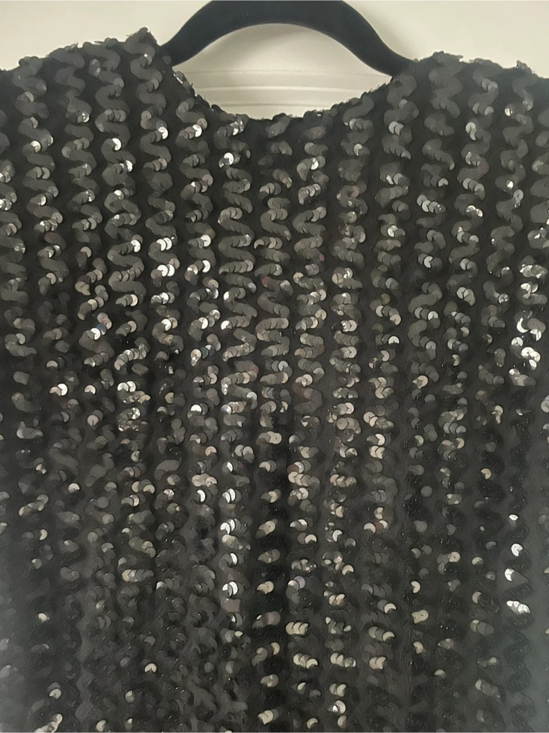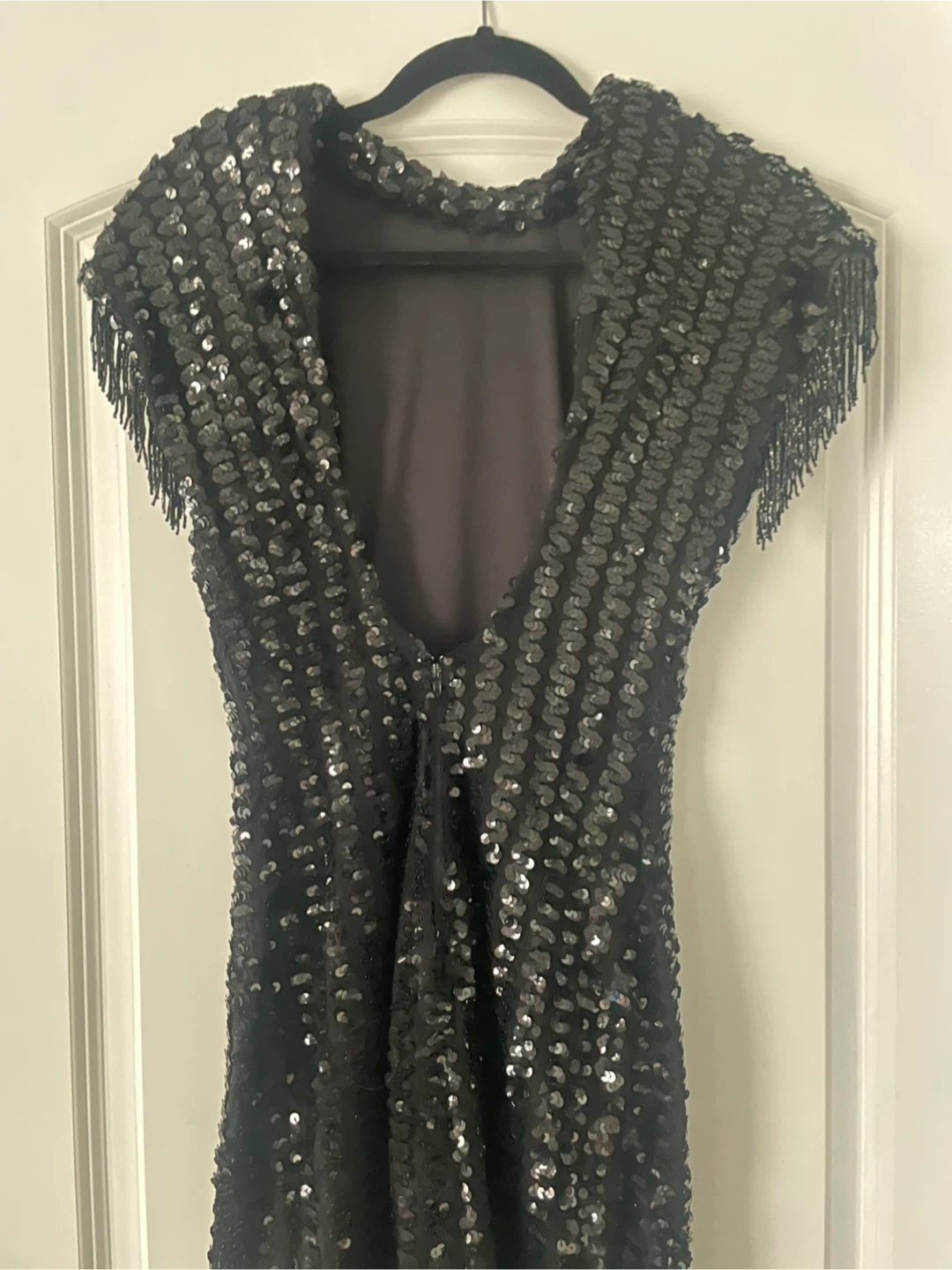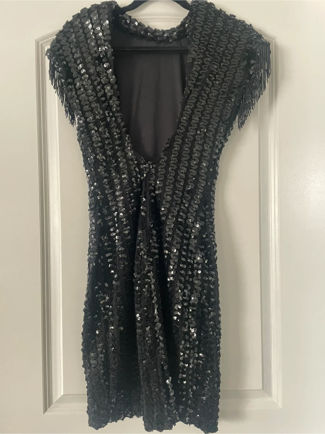 Here's a fun and sparkly black sequin mini dress! It has a low back and fringe detail on the sleeves. Perfect for a night out! Size small