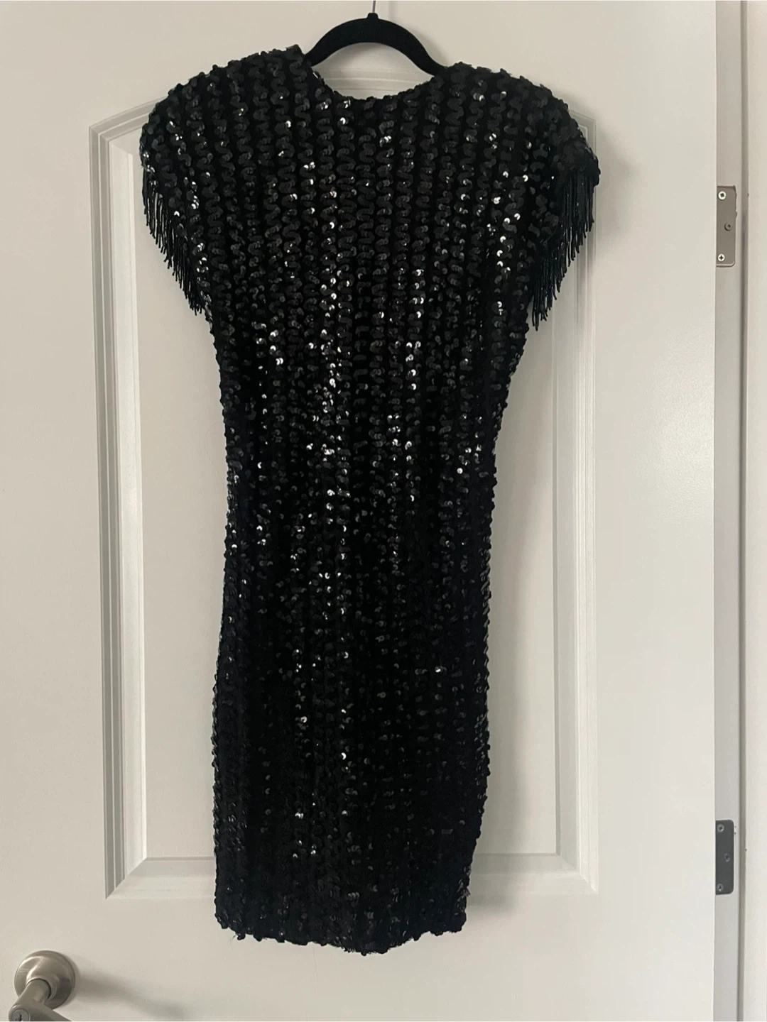 Here's a fun and sparkly black sequin mini dress! It has a low back and fringe detail on the sleeves. Perfect for a night out! Size small
