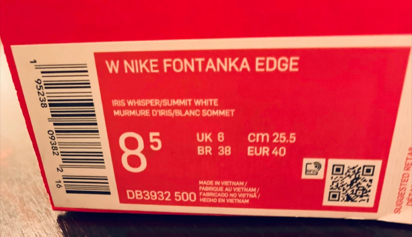 Women's Nike Fontanka Edge running shoes. Size 8.5. Iris Whisper/Summit White colourway. Features Nike ZoomX cushioning. In original box. New, never worn