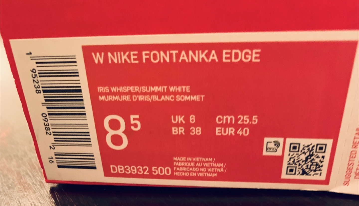 Women's Nike Fontanka Edge running shoes. Size 8.5. Iris Whisper/Summit White colourway. Features Nike ZoomX cushioning. In original box. New, never worn