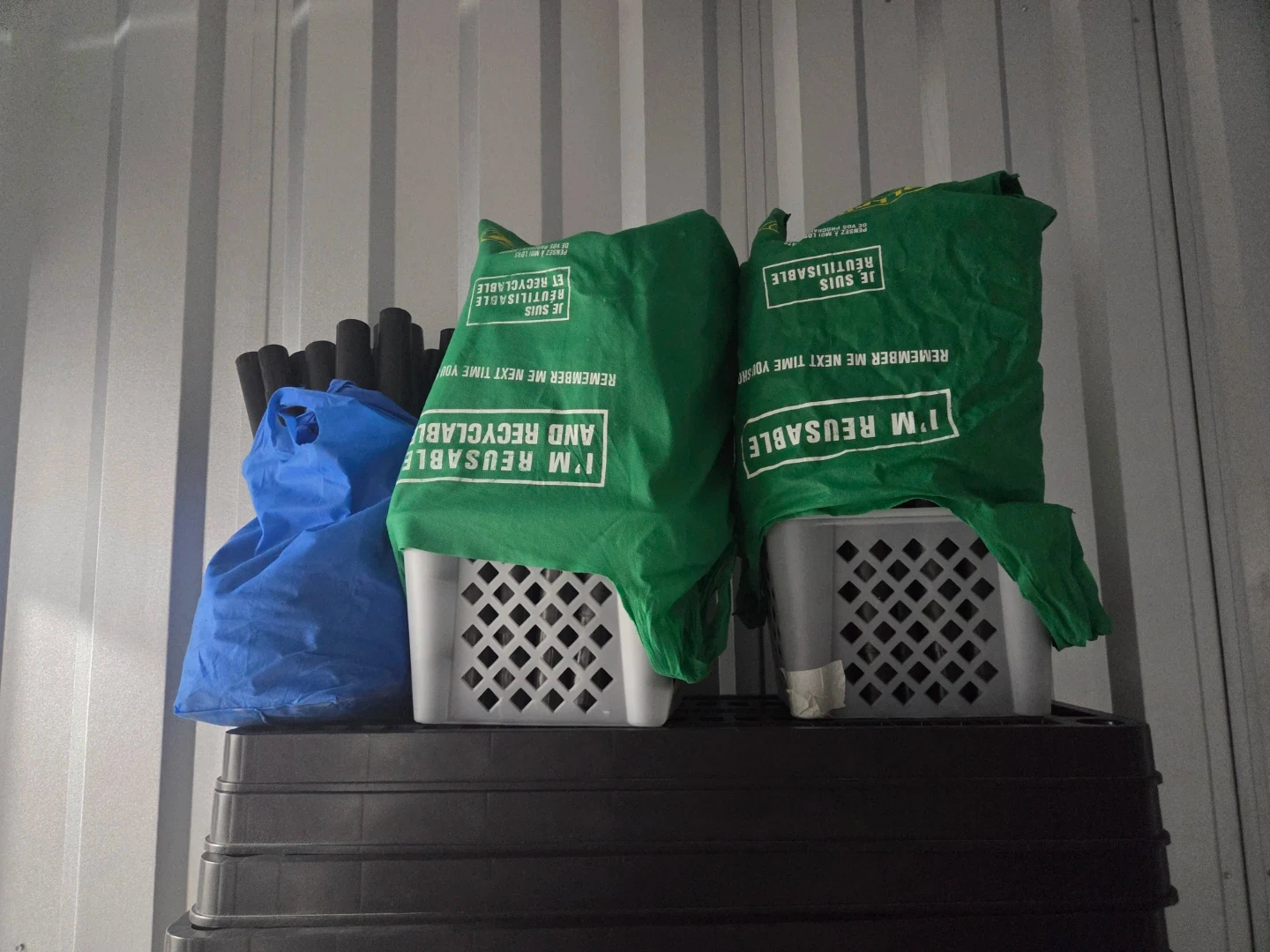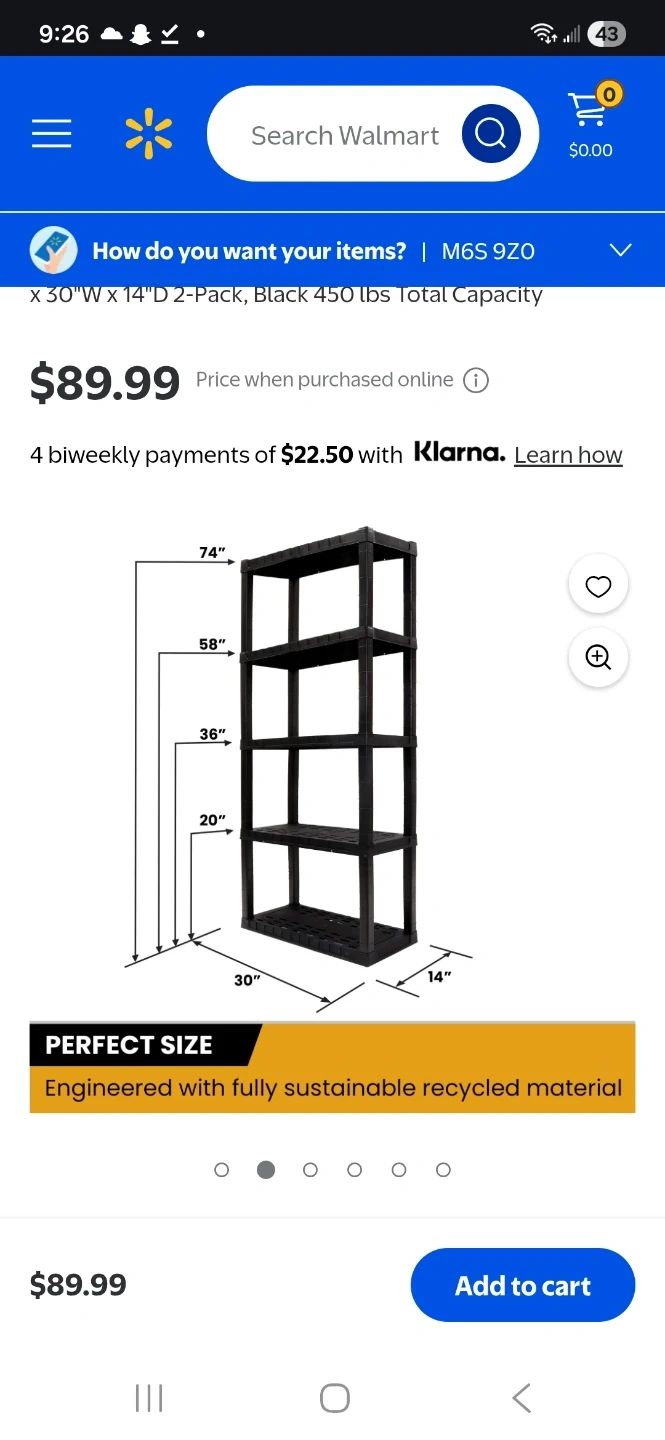 This 5-tier shelving unit is 30 inches wide and 14 inches deep. It's made with recycled material and has a total capacity of 450 lbs. The unit is black and comes with five shelves.