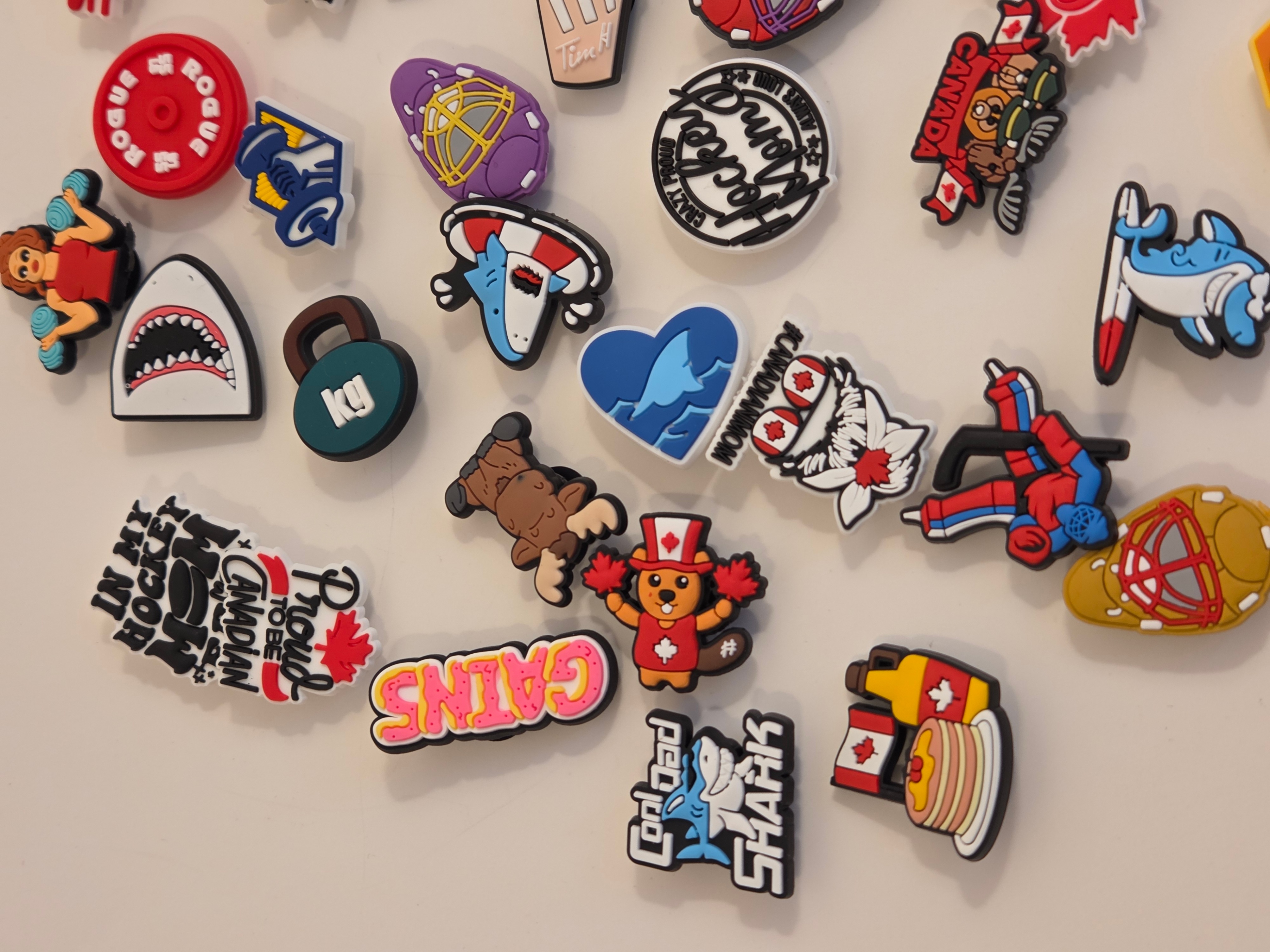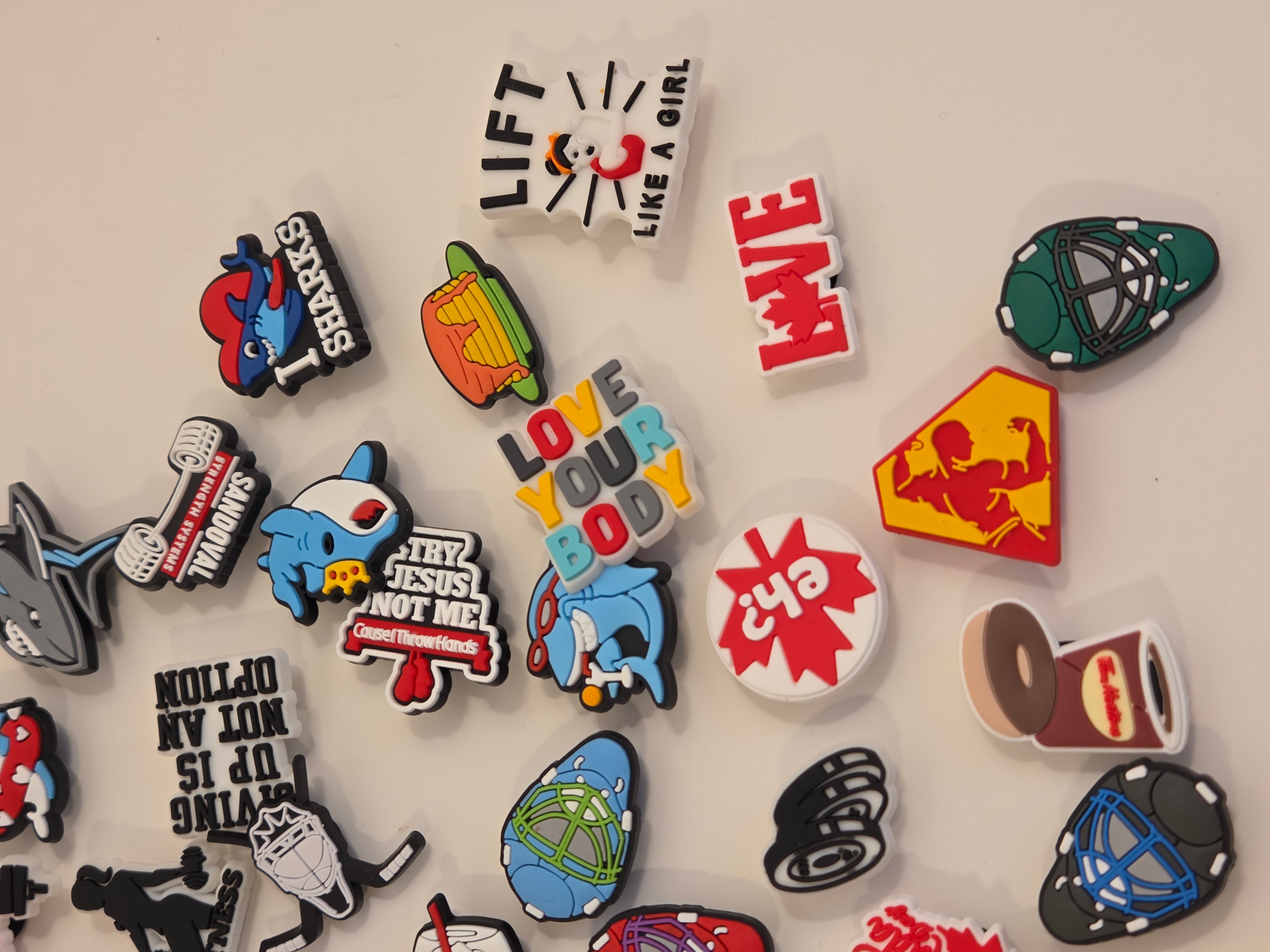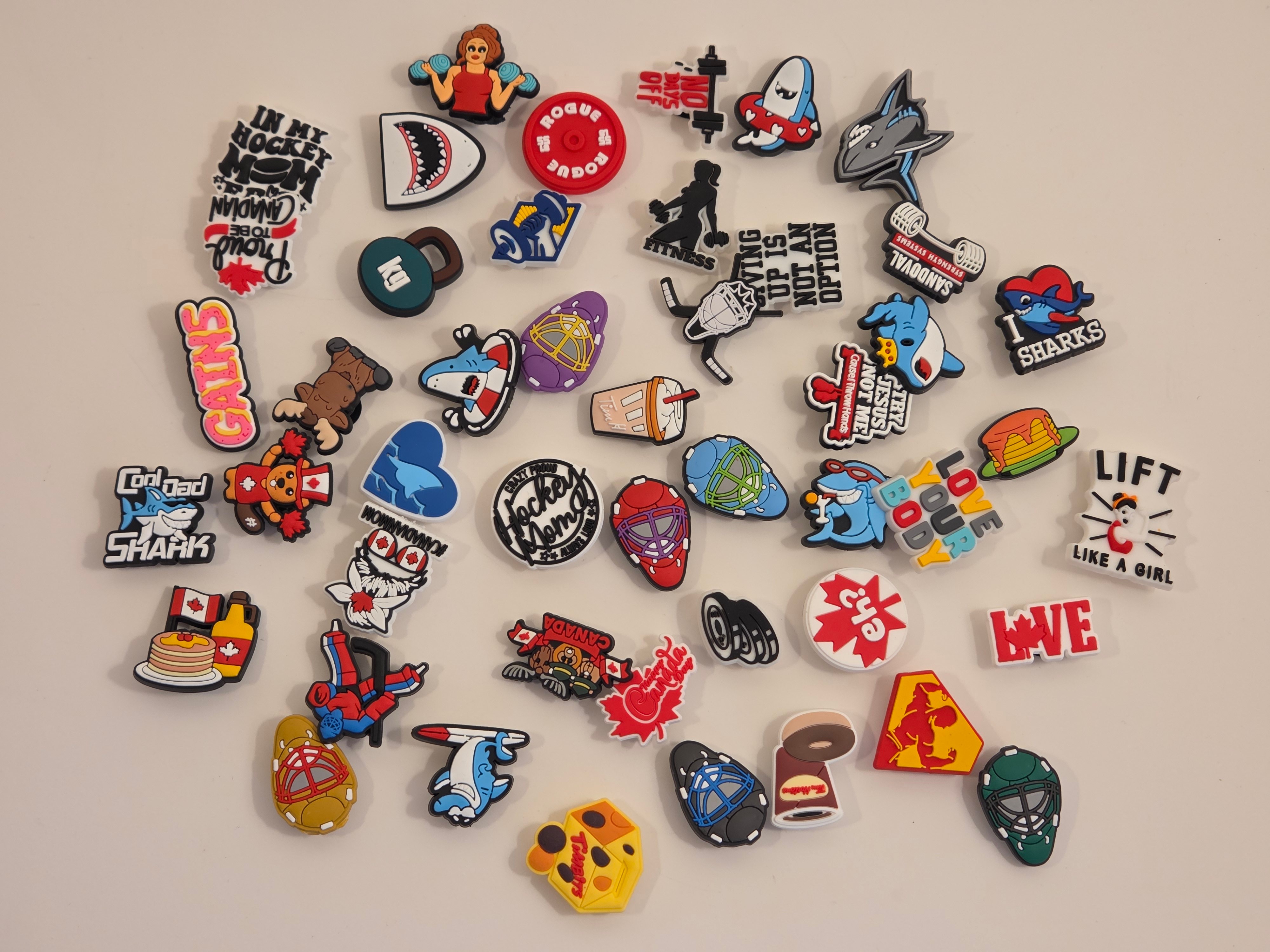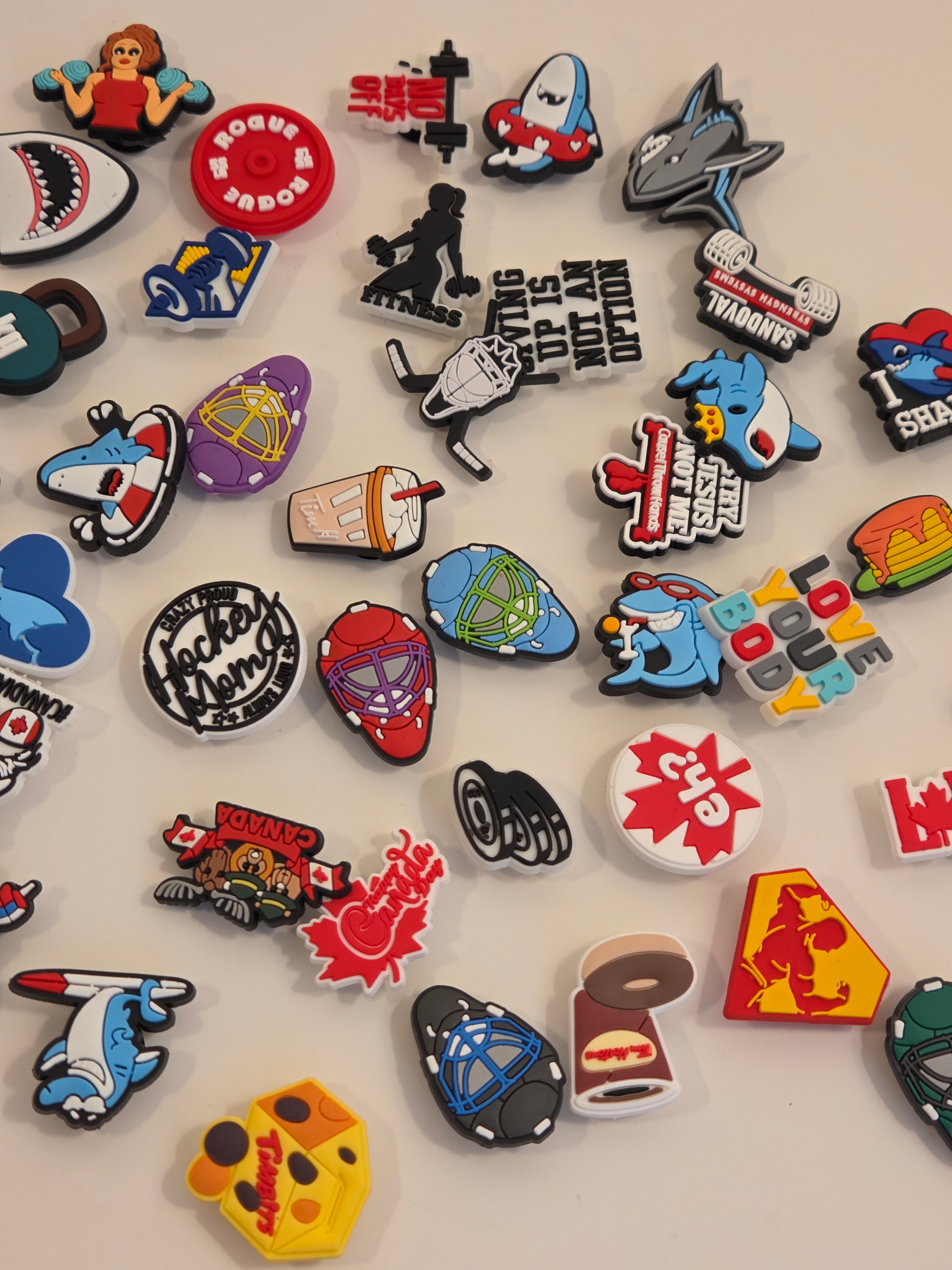 Fun bundle of Crocs-style shoe charms – all brand new and never used. Themes include hockey masks, sticks and goalie, Canada/Maple Leaf, Tim Hortons cup, sharks, fitness and more. Standard Jibbitz-style plug fits Crocs clogs and sandals.