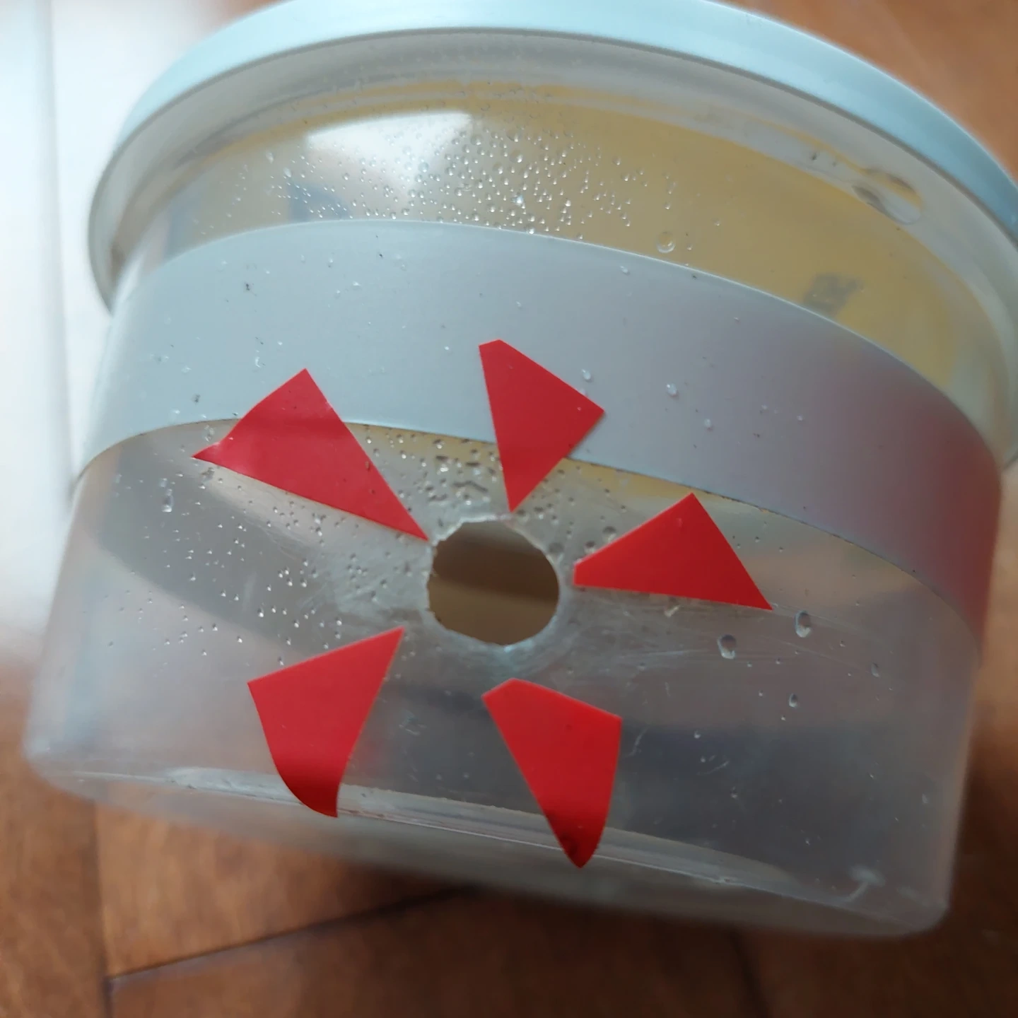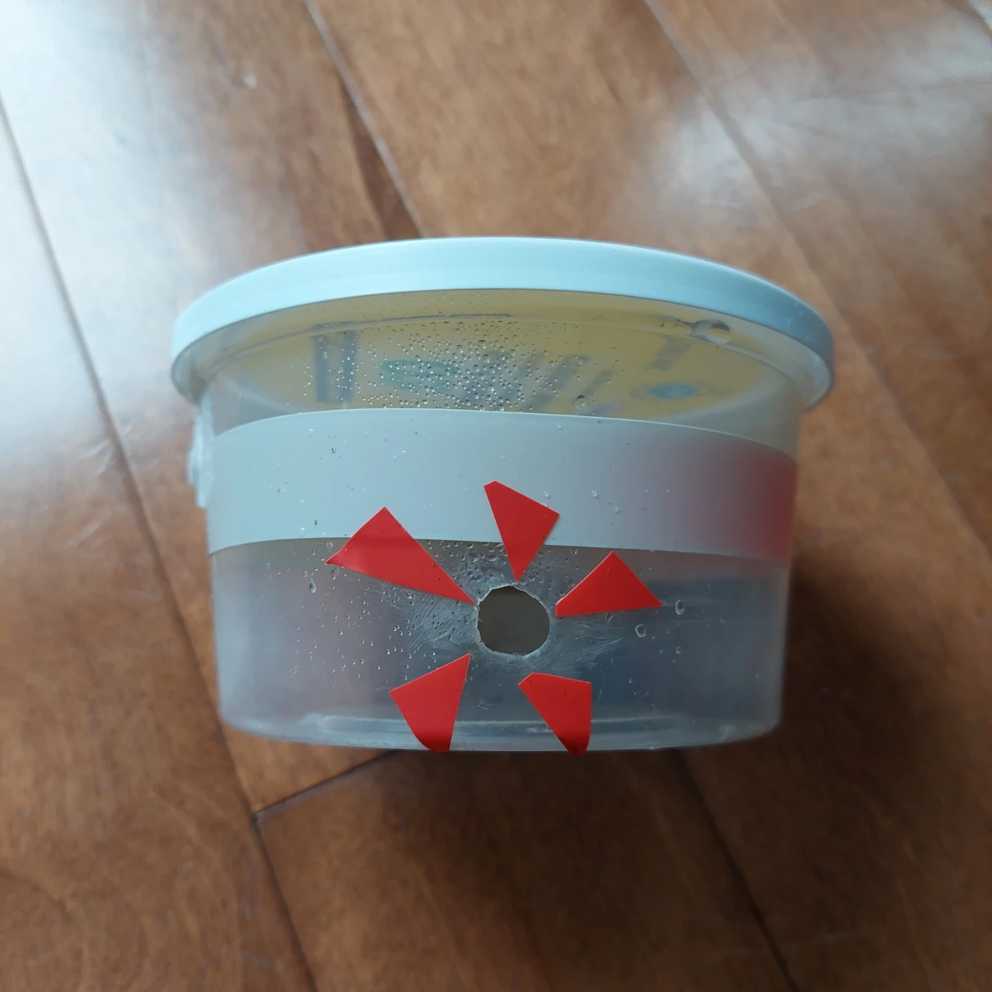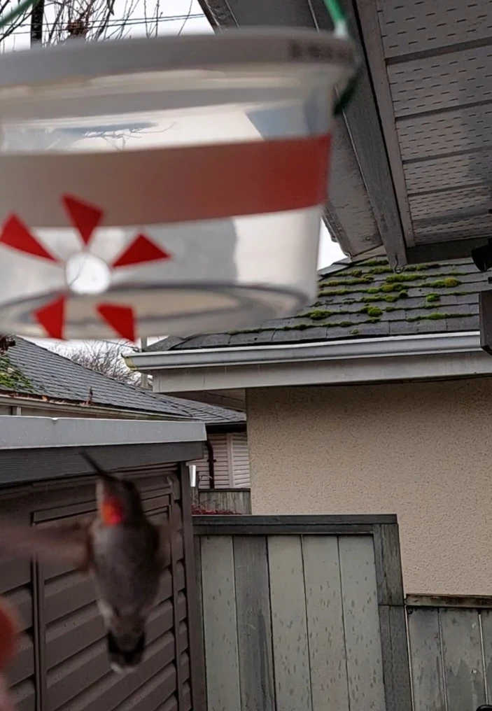 Selling a used hummingbird feeder. It's in good condition and ready to attract some beautiful birds to your yard! It is a DIY clear plastic container with a red band and flower-shaped feeding port. Works great but we bought a new one. All you need is some wire to loop through the side holes and then hang it up.