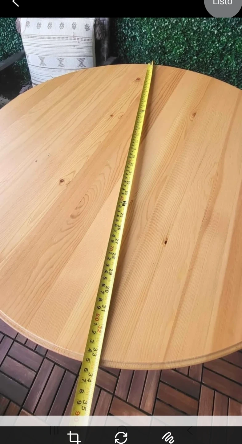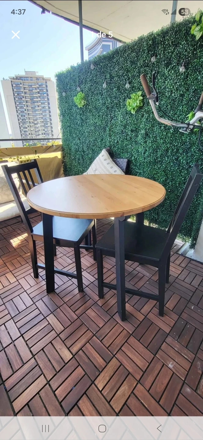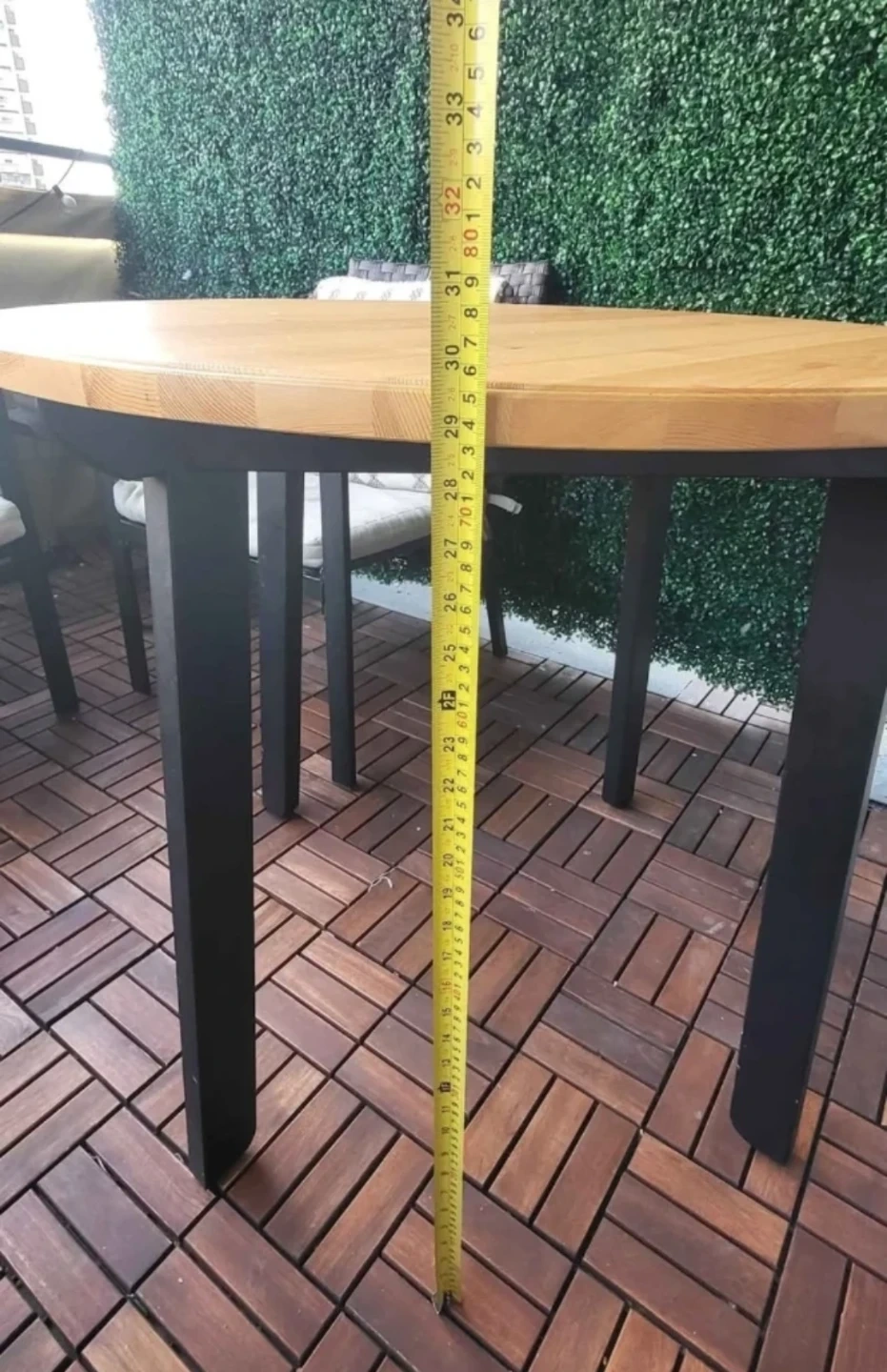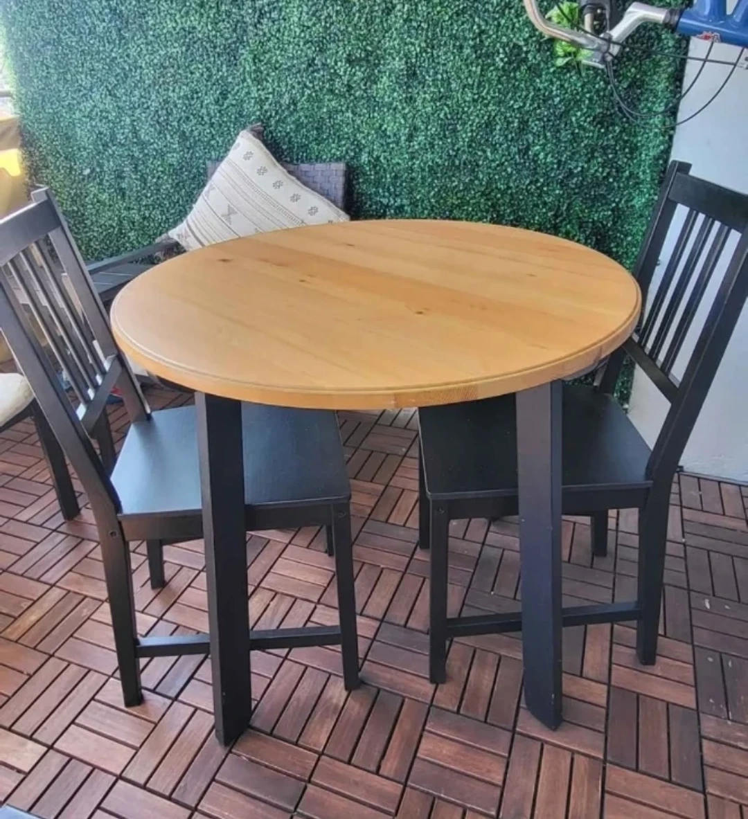 Selling a round wooden dining table with black legs. It measures approximately 33 inches in diameter and 30 inches in height. Great for a small dining area or balcony!