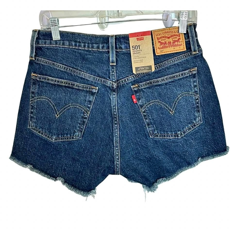 These Levi's blue jean shorts feature a high-waisted design with a raw, cut-off hem for a casual, laid-back look. Crafted from durable denim, they offer a fitted silhouette through the hips and thighs, making them a stylish choice for warm weather outings.