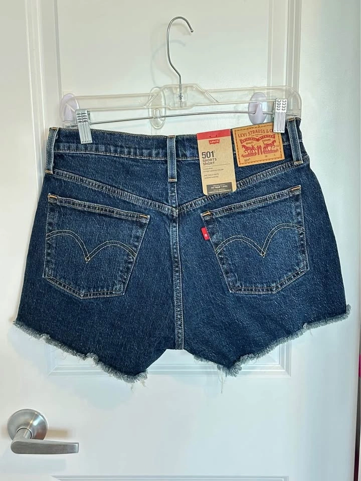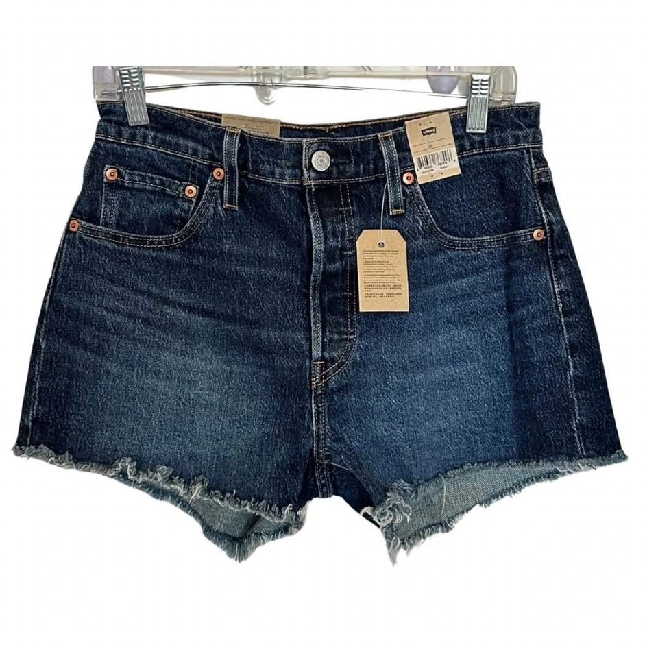 These Levi's blue jean shorts feature a high-waisted design with a raw, cut-off hem for a casual, laid-back look. Crafted from durable denim, they offer a fitted silhouette through the hips and thighs, making them a stylish choice for warm weather outings.