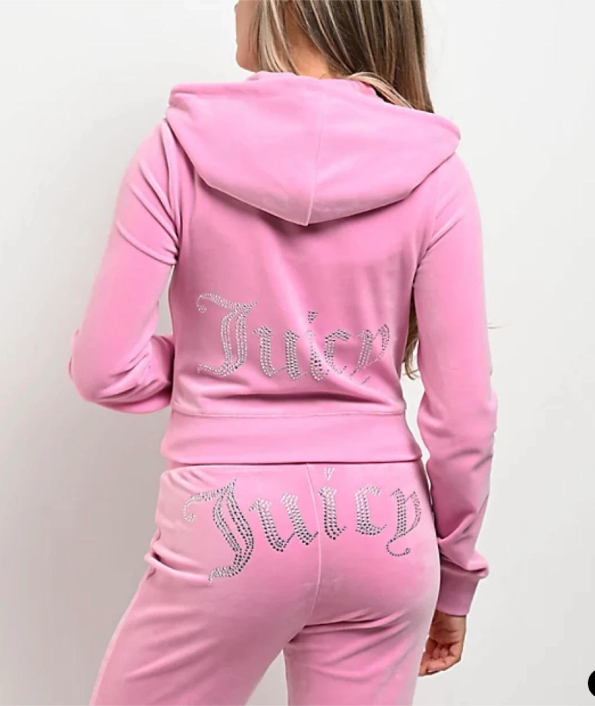 Selling a cute Juicy Couture tracksuit in pink velour! The set includes a zip-up hoodie and matching pants. The hoodie has the Juicy logo on the back in rhinestones, and so do the pants. It's in great condition and perfect for a comfy and stylish look. Size XL, new with tags