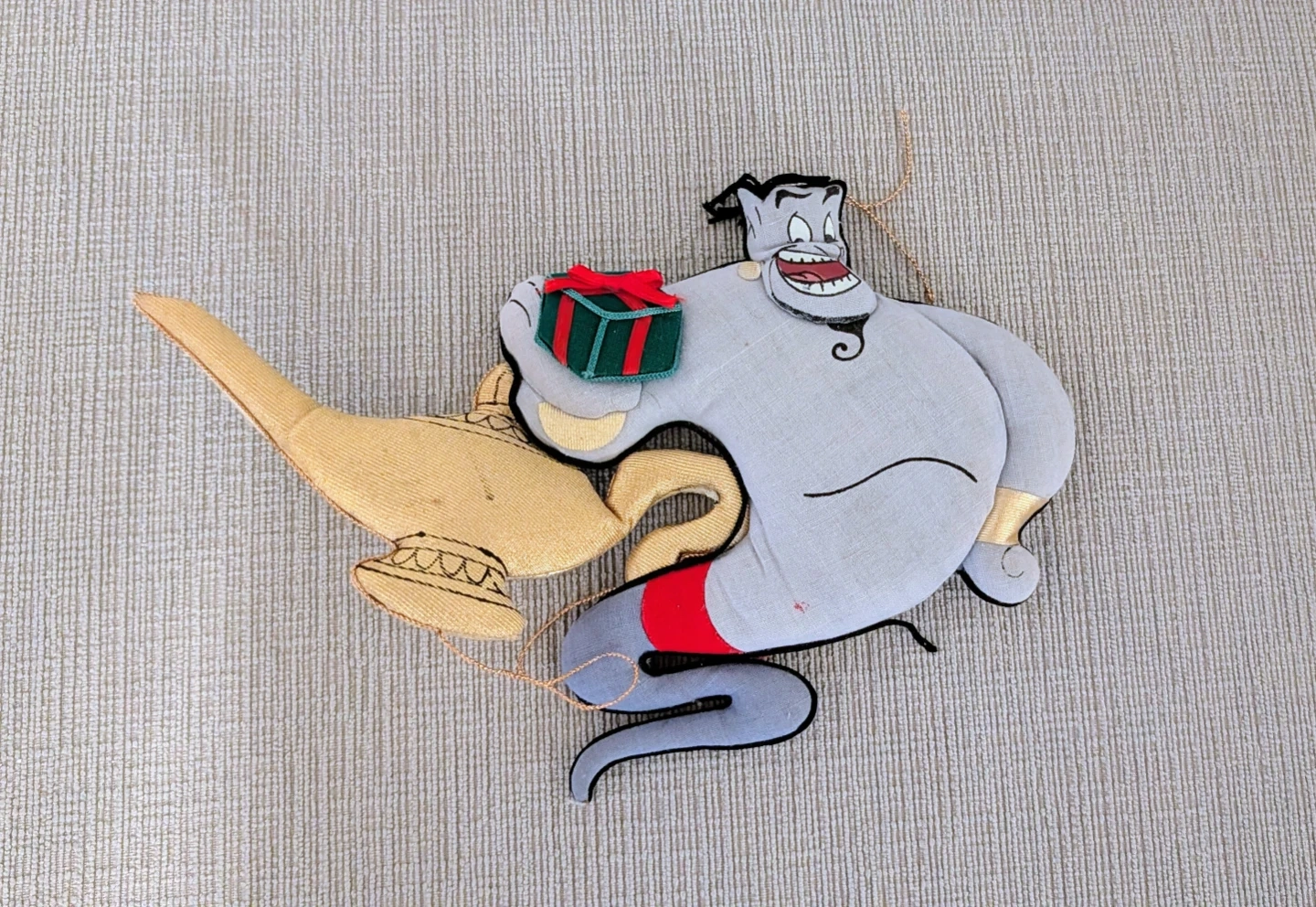 Here's a cute Disney Aladdin plush ornament. It features the Genie holding a gift and the magic lamp. Great for a Disney fan or to add a touch of magic to any room