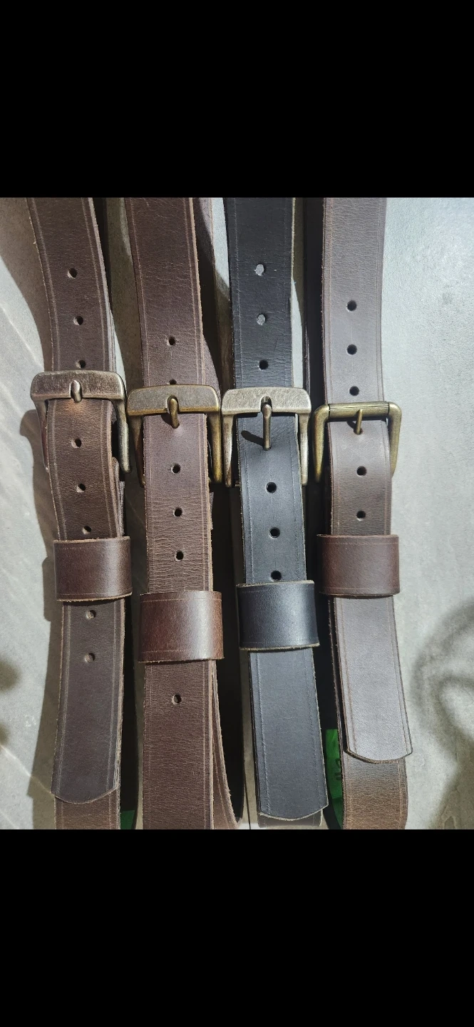 New handmade in Ottawa by me, solid buffalo leather, 1.5" wide. Have a couple unsold that are sized 36 to 42", and a couple ready for sizing. $60 each, shipping extra if needed. Black and dark brown available, solid brass buckles. Will last decades