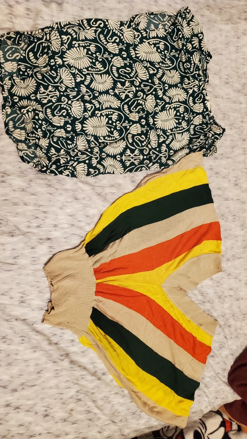 Selling a couple of cute tops! One is a dark green and white patterned blouse, and the other is a colourful striped sweater. Both are in good condition and ready for a new wardrobe