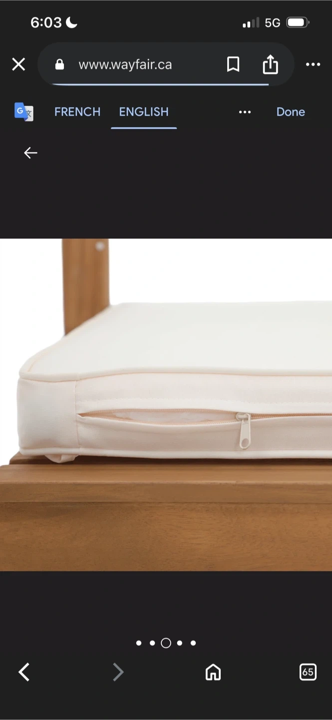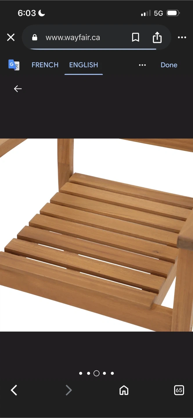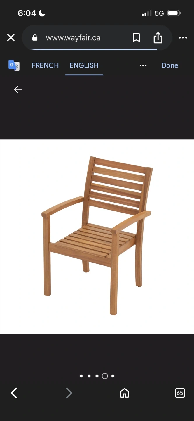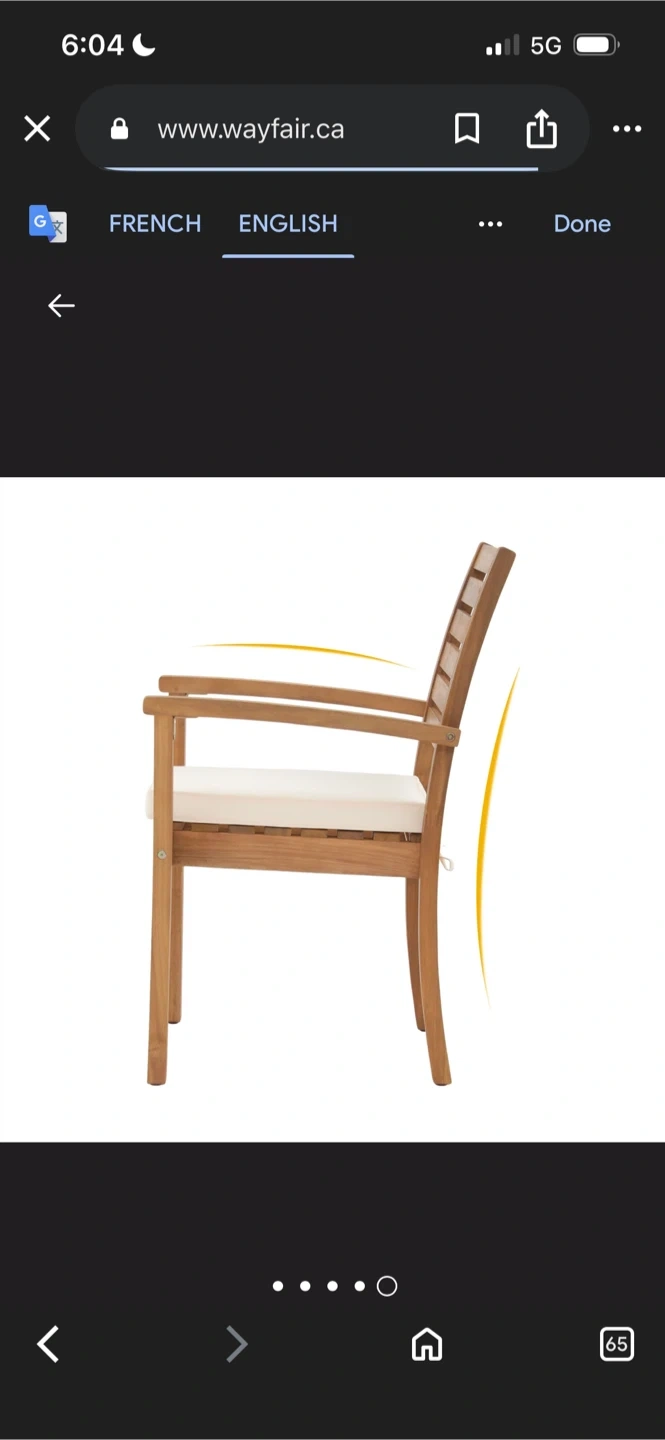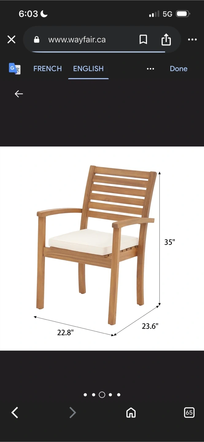 Here's a comfy outdoor armchair from Wayfair! It has a wooden frame and a cream-coloured seat cushion. The chair measures about 35" in height, 22.8" in width, and 23.6" in depth, perfect for relaxing on the patio or in the garden
