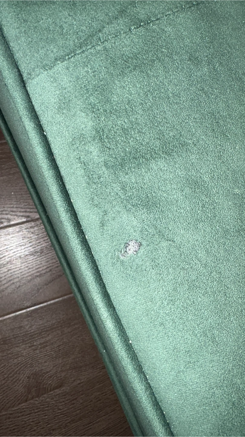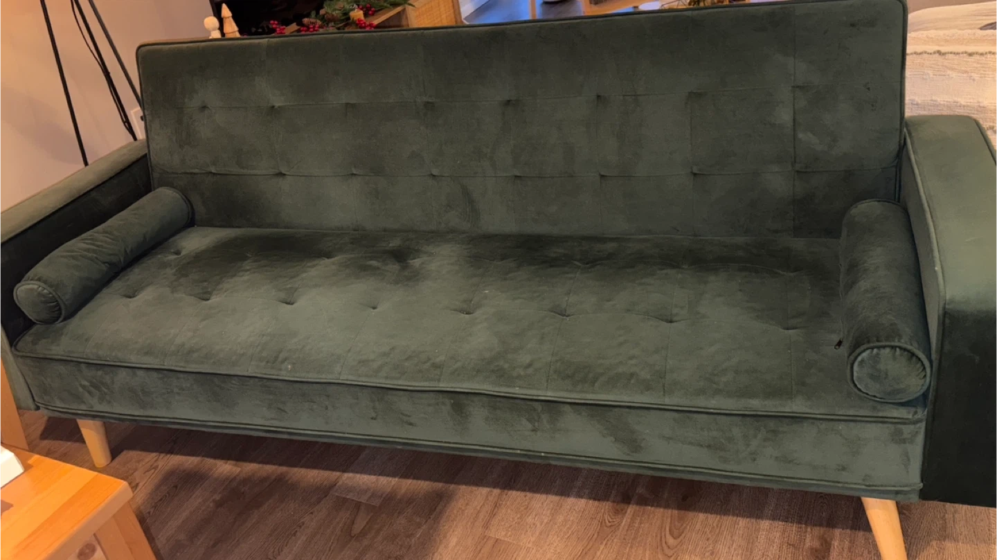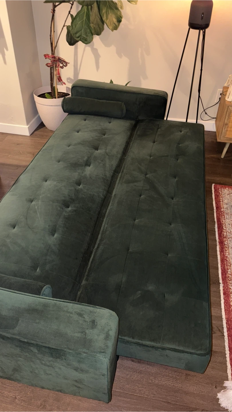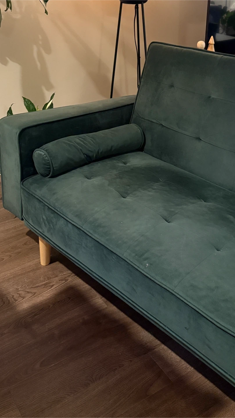 Selling a green velvet futon sofa bed. It has a modern look and can be used as a sofa or a bed. There is a stain on the sofa. Perfect for students and small spaces.