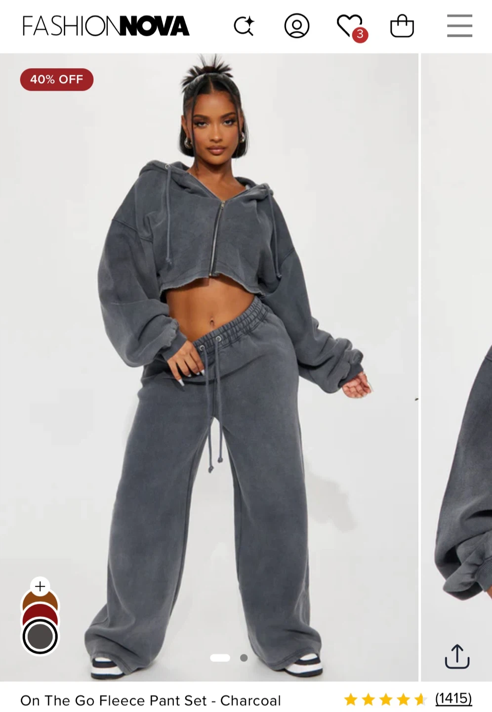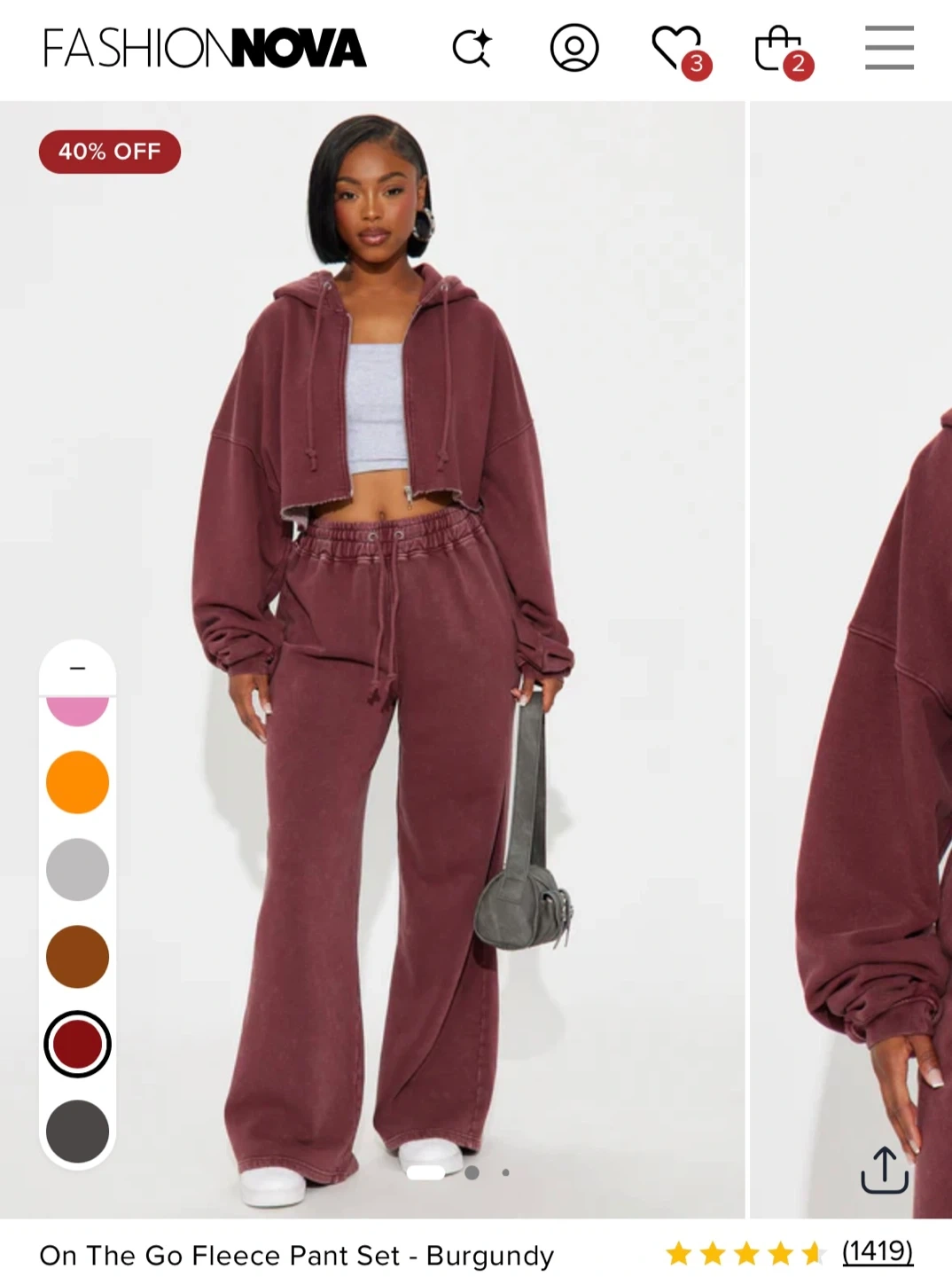Selling 2 Fashion Nova “On The Go Fleece Pant Sets” in burgundy and charcoal. Each set features a cropped hoodie and wide-leg pants with super soft fleece lining (60% cotton, 40% polyester).