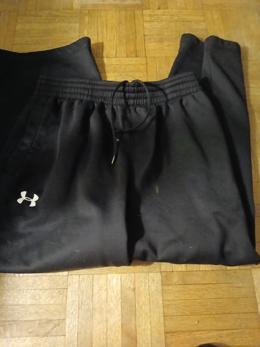Selling a pair of comfy Under Armour fleece pants in size large. They're black and have the Under Armour logo on the left leg. Perfect for lounging or working out!