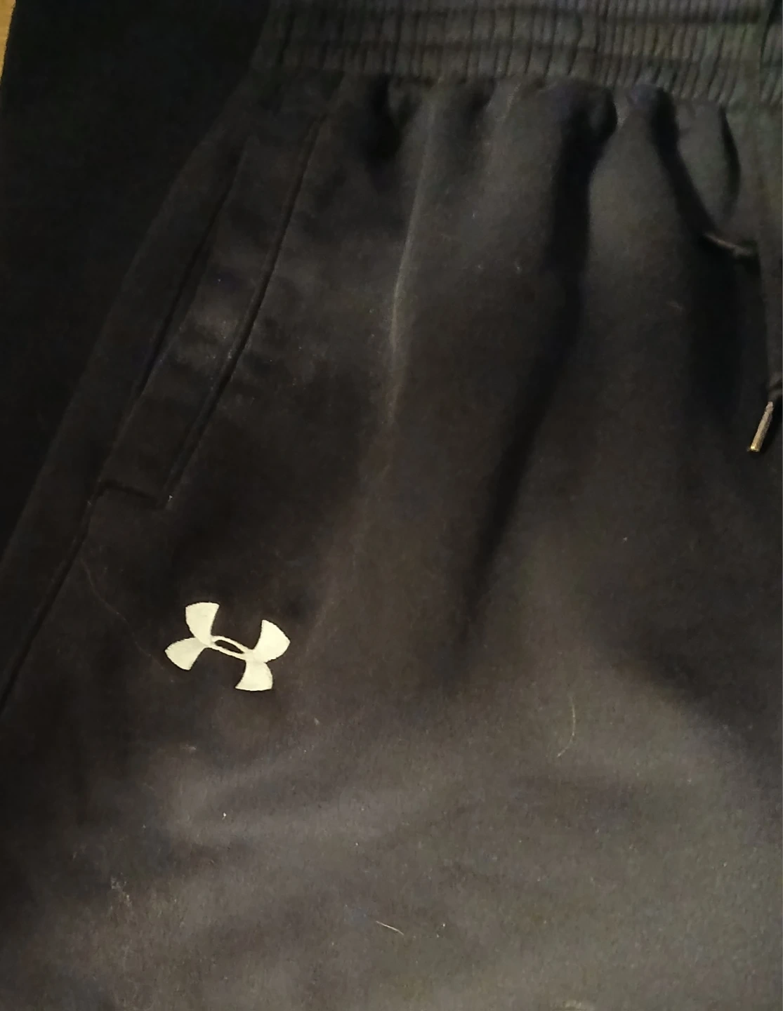 Selling a pair of comfy Under Armour fleece pants in size large. They're black and have the Under Armour logo on the left leg. Perfect for lounging or working out!