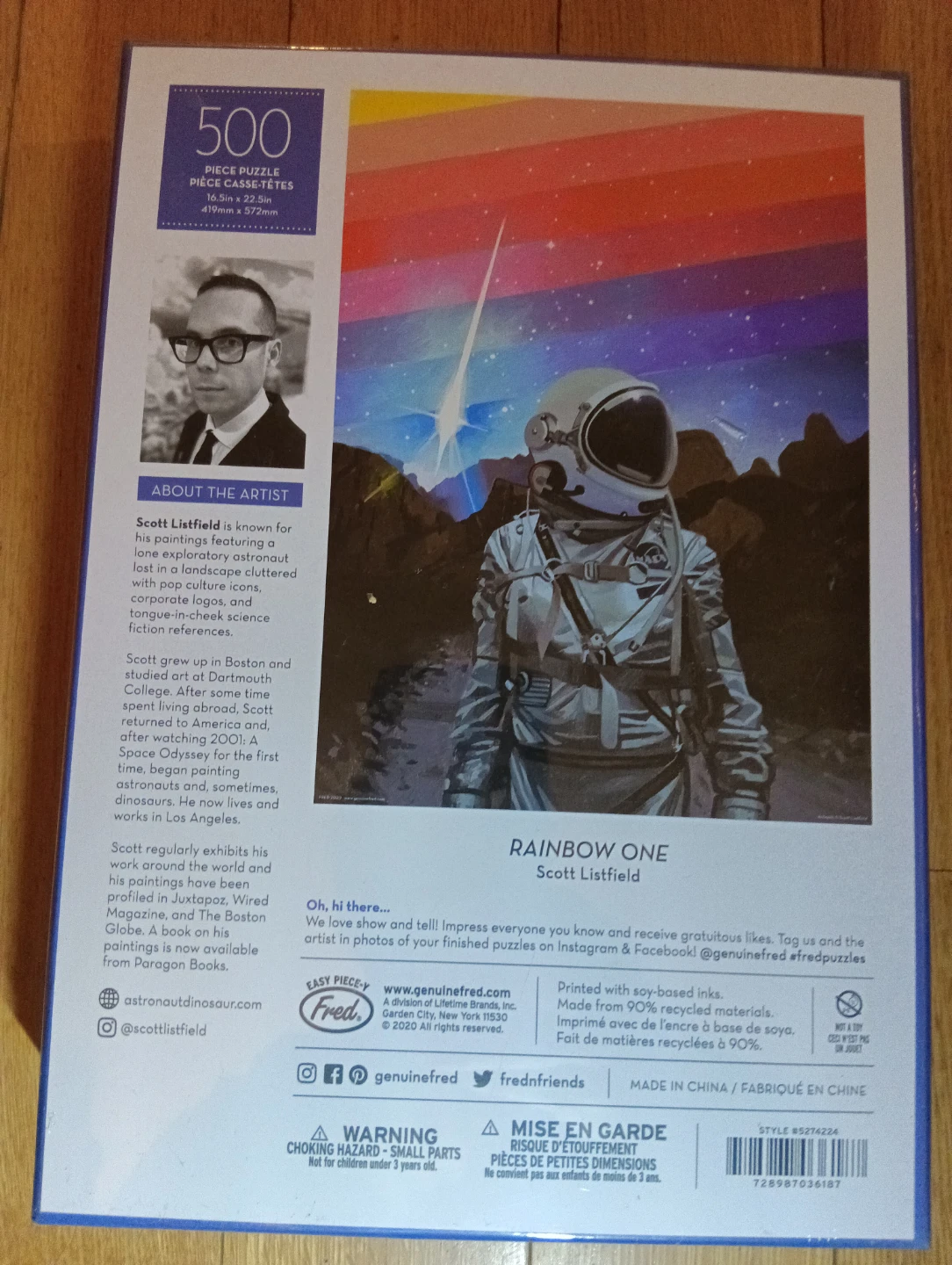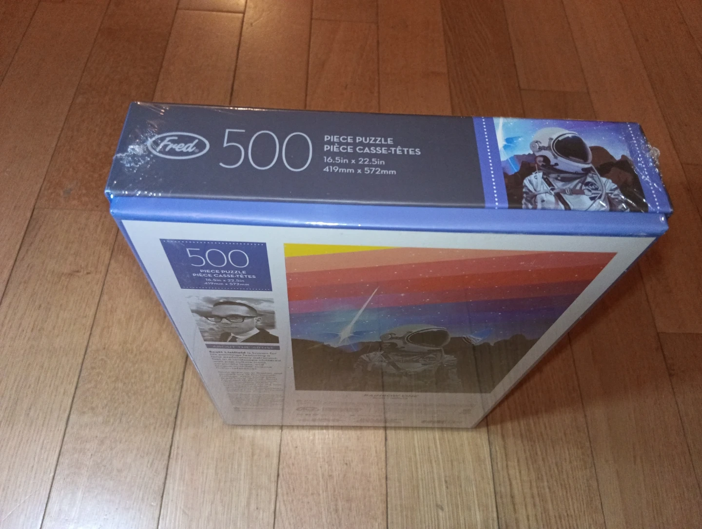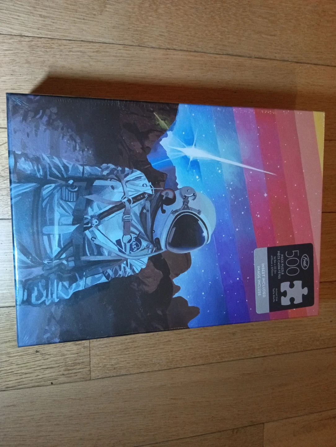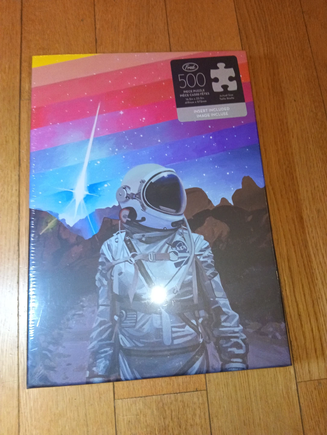 Selling a brand new, still-sealed Fred 500-piece puzzle! It features a cool astronaut design and is ready for someone to enjoy putting it together. The puzzle's dimensions are 16.5in x 22.5in (419mm x 572mm).