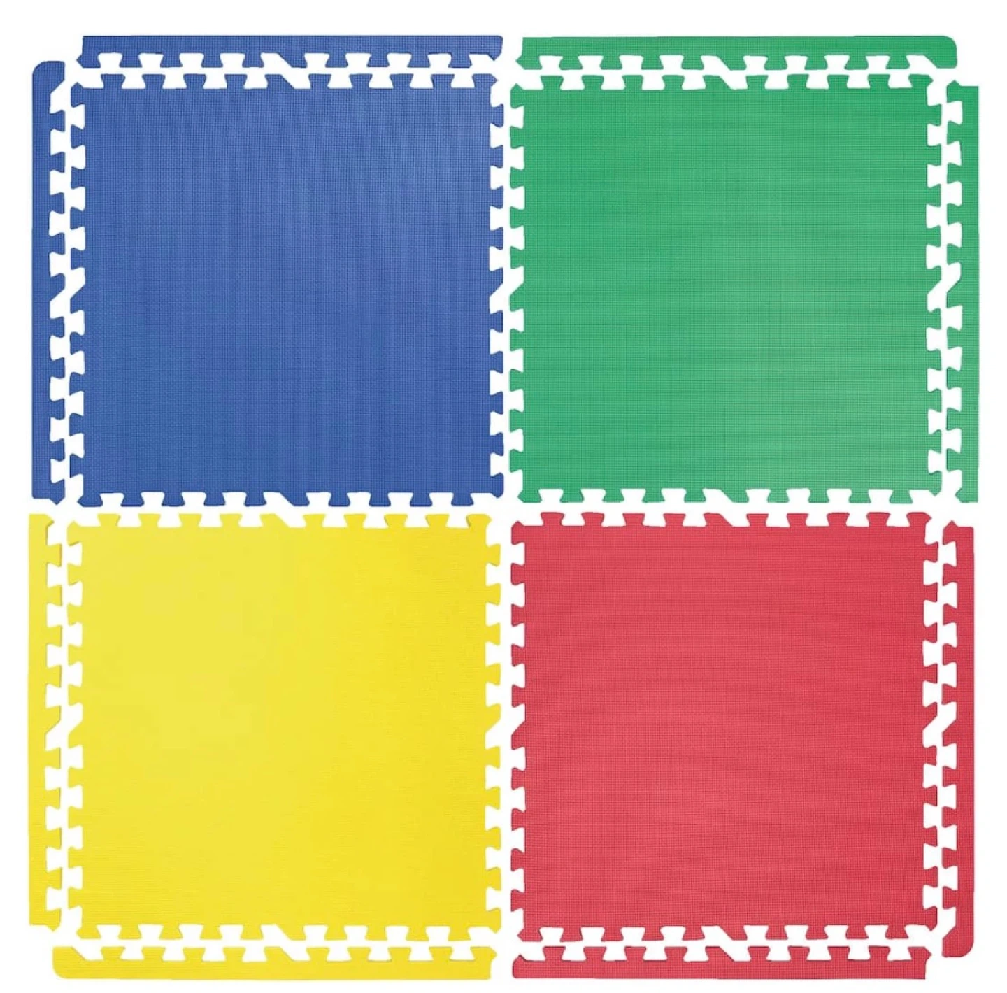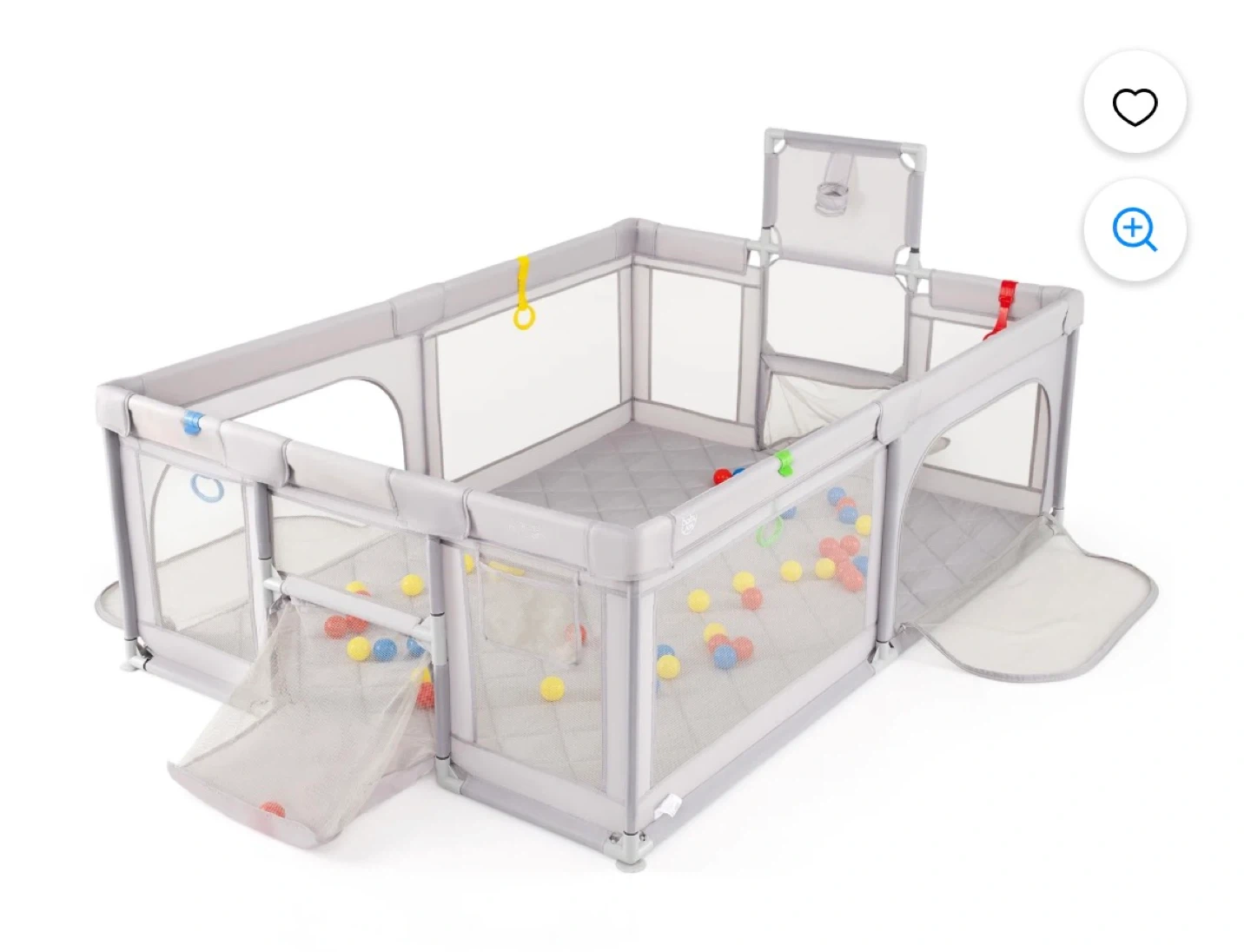 I'm selling a set of colourful foam play mat tiles and a playpen. The play mat tiles are in blue, green, yellow, and red. The playpen is grey and features mesh sides for visibility and safety! It's a great way to create a safe and fun play area for your little one