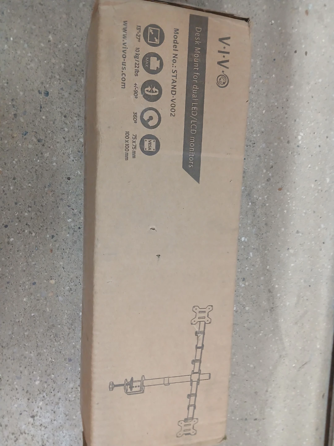 Selling a VIVO desk mount for dual LED/LCD monitors. The model number is STAND-V002. It's designed for 13"-27" monitors, supports 10 kg/22 lbs, and has a +90°/-90° tilt. It also features 360° swivel and 100x100 mm VESA compatibility. Great for setting up a dual monitor workstation!