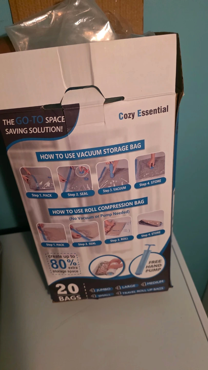 Get organized with this set of vacuum storage bags. Different sizes. They're a cozy essential for saving space. The box includes a free hand pump to help you compress everything down. Create up to 80% extra storage space. Open and use about 2 bags