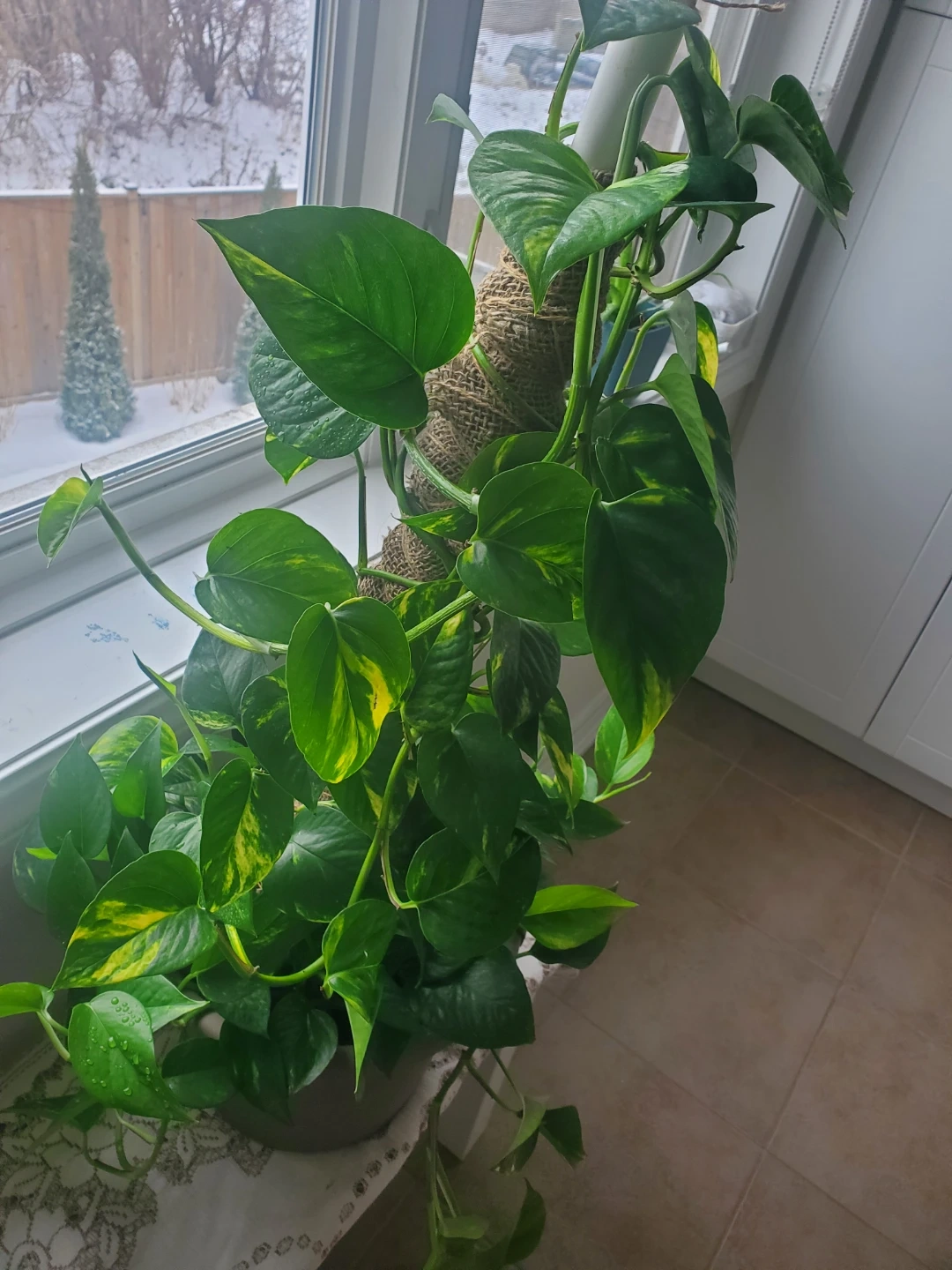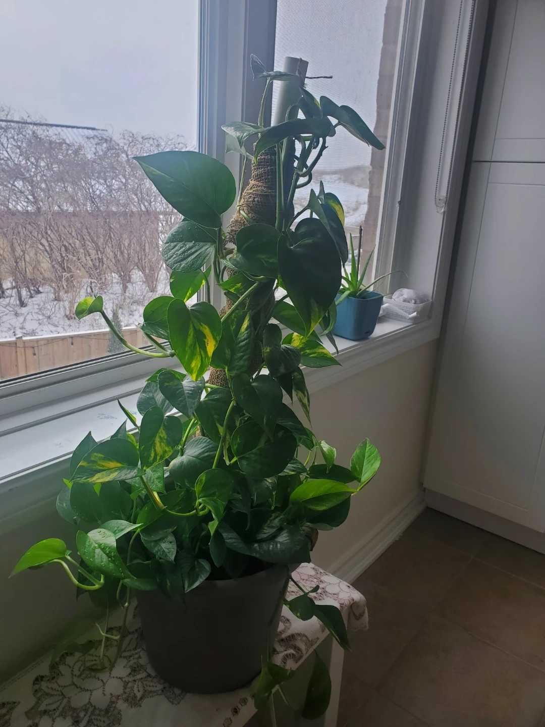 Selling a healthy pothos plant with a moss pole! It's a beautiful addition to any home and easy to care for. The moss pole helps the plant climb and grow taller, making it a lovely decorative piece