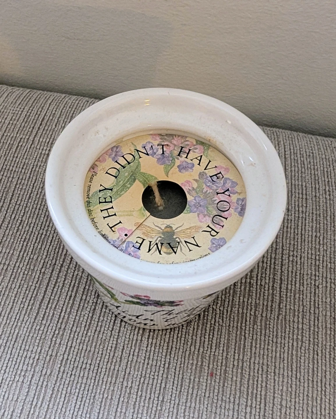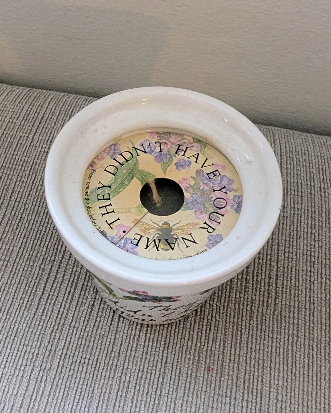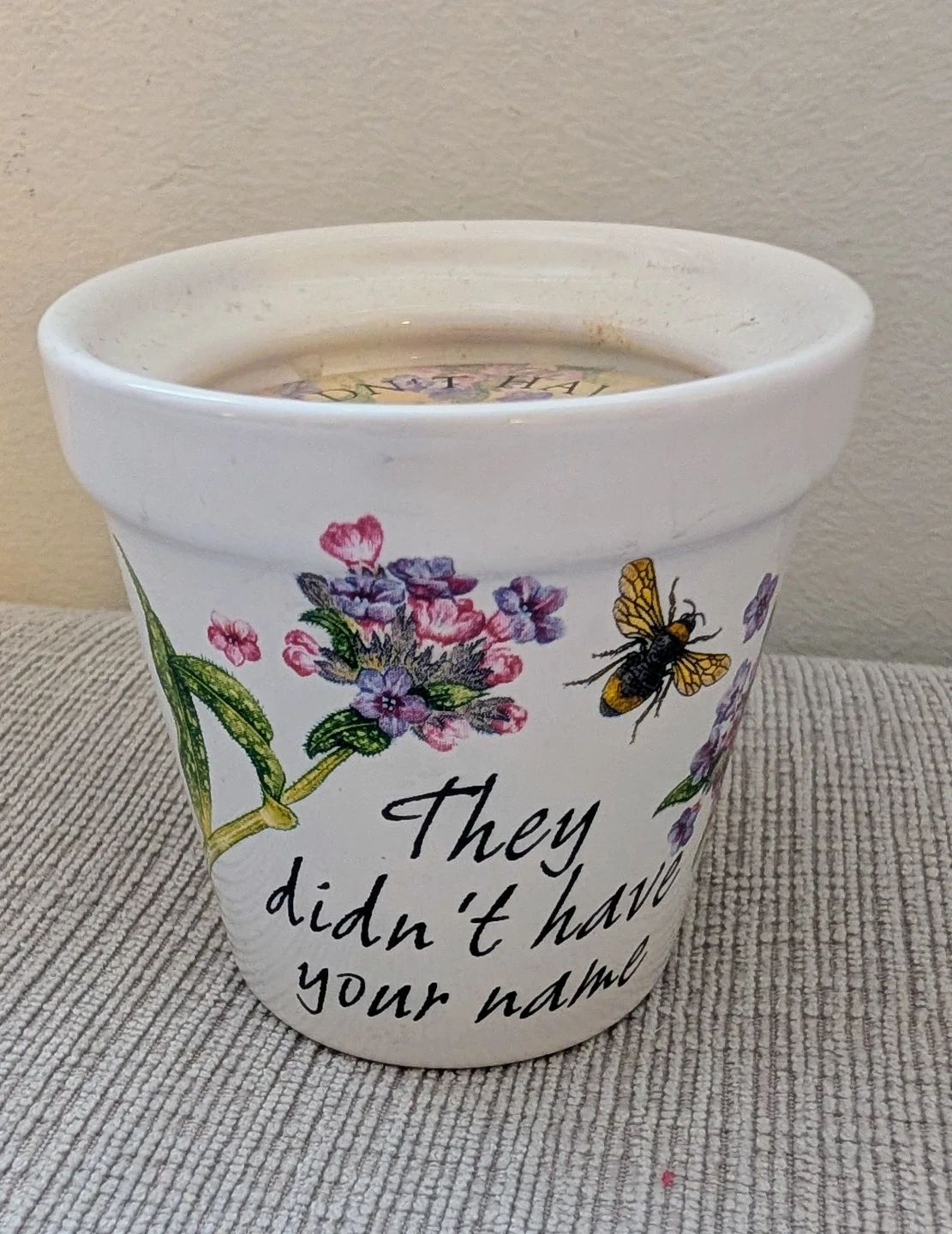 Here's a cute stoneware flower pot from H&H History & Heraldry! It features a floral and bee design with the text 'They didn't have your name'. Perfect for adding a touch of charm to your plants