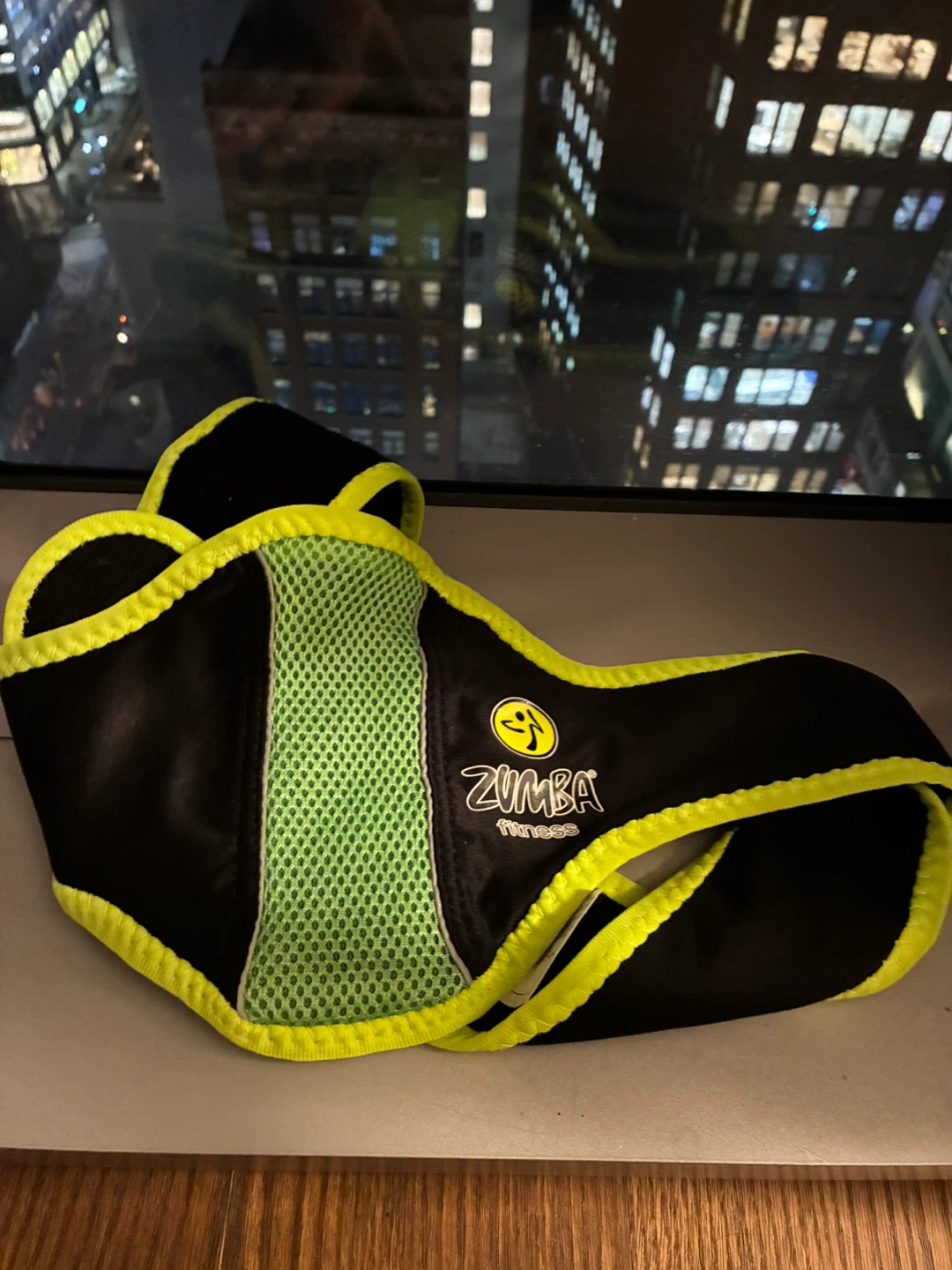 Get ready to dance your way to fitness with this Zumba Fitness Velcro belt! It's black with bright neon yellow trim and a breathable green mesh panel.